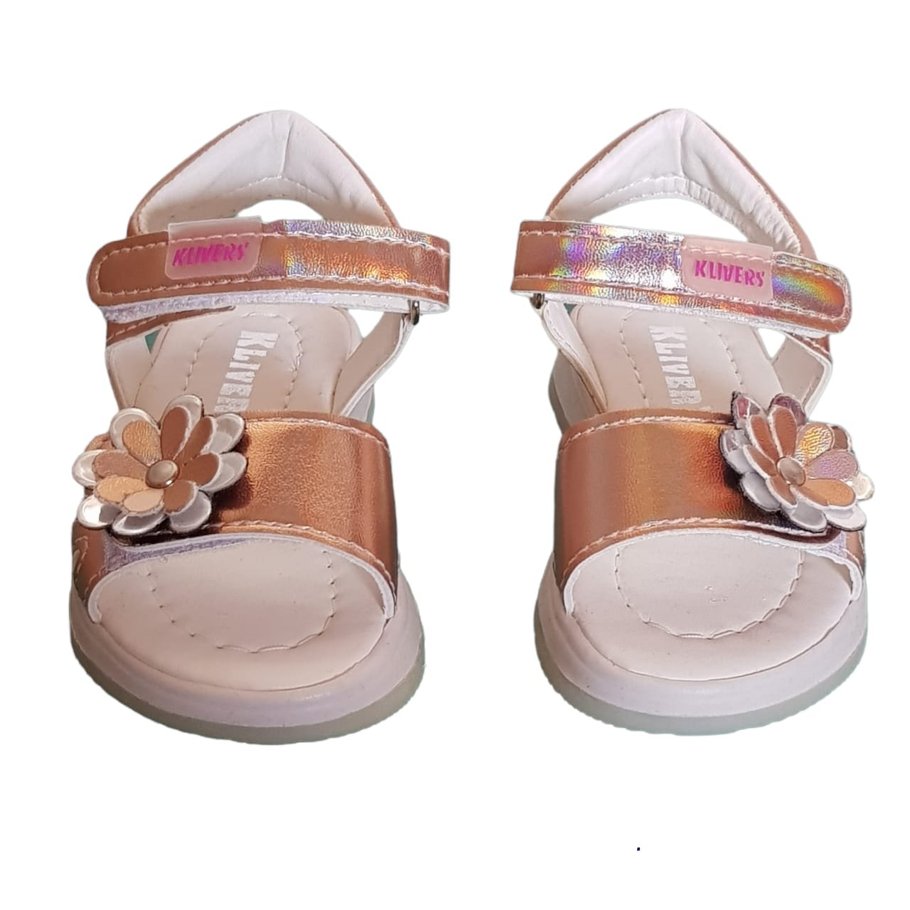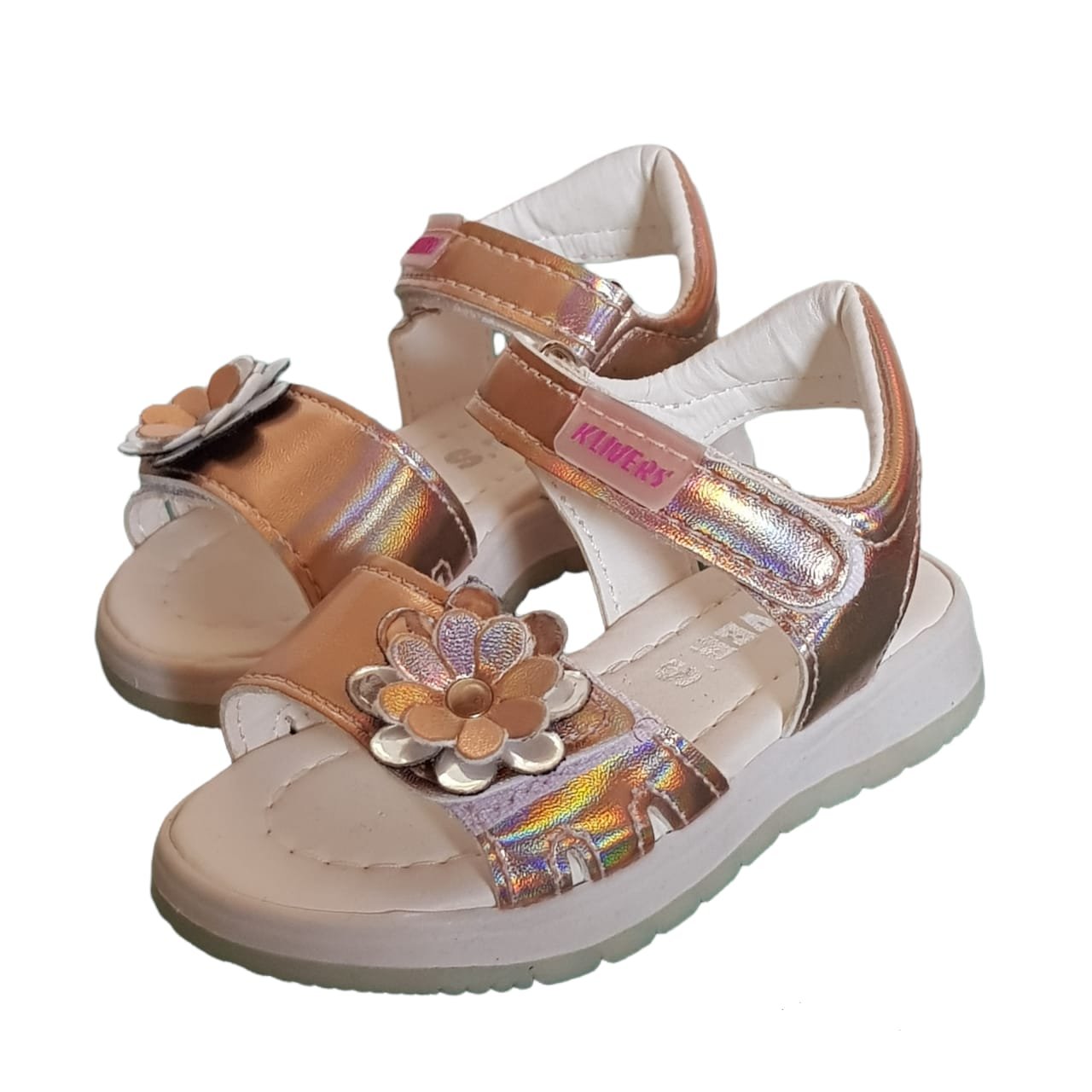 Sandalia con velcro tornasolada con planta de goma y aplique en flor