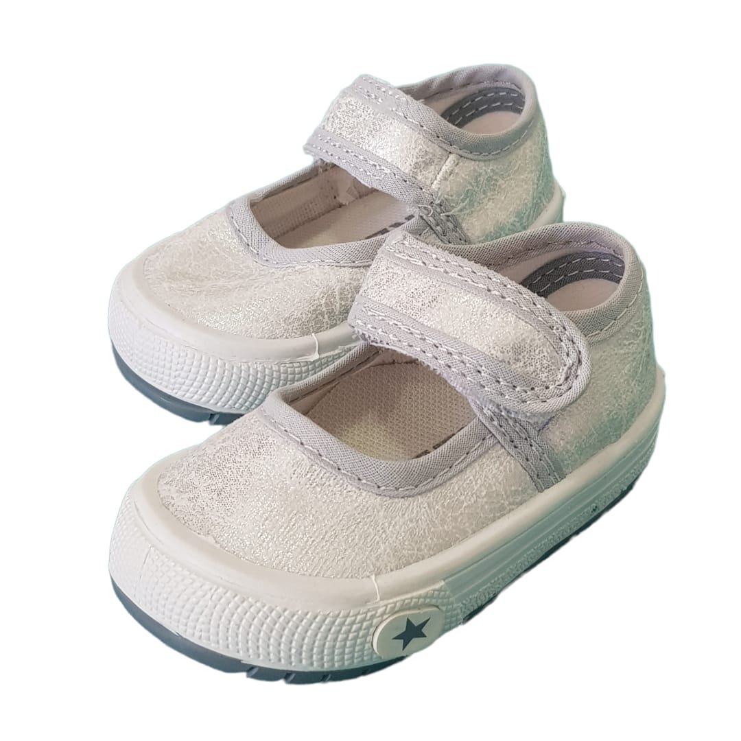 Guillermina capellada de raso color plata con velcro, planta de goma liviana, flexible y antideslizante.