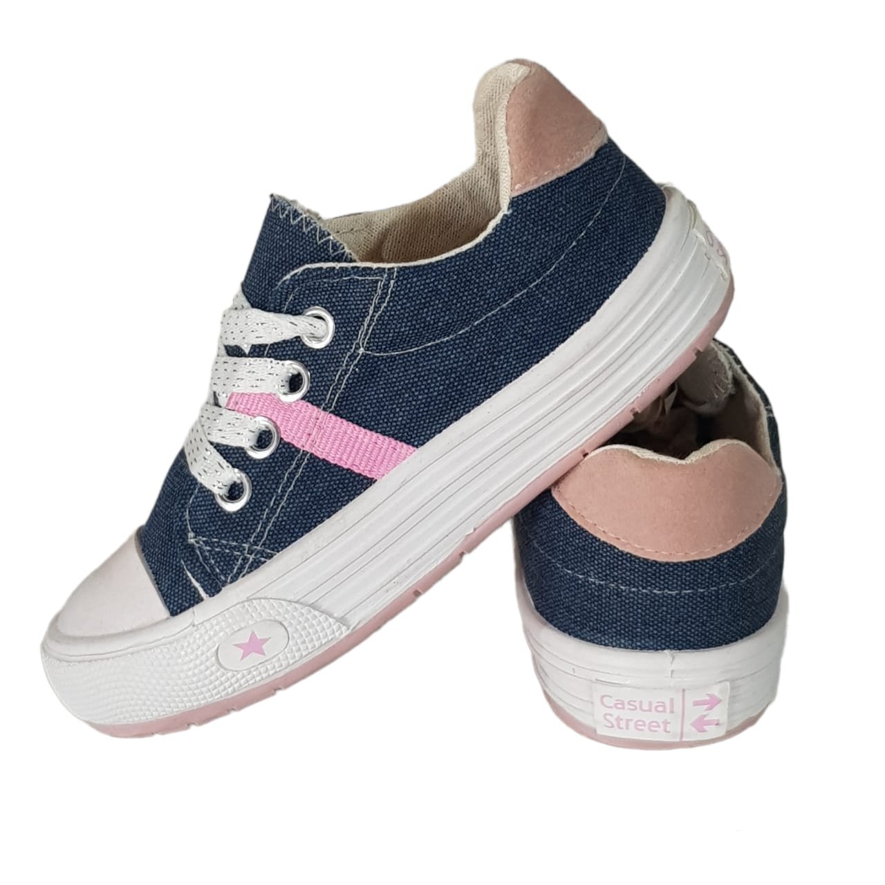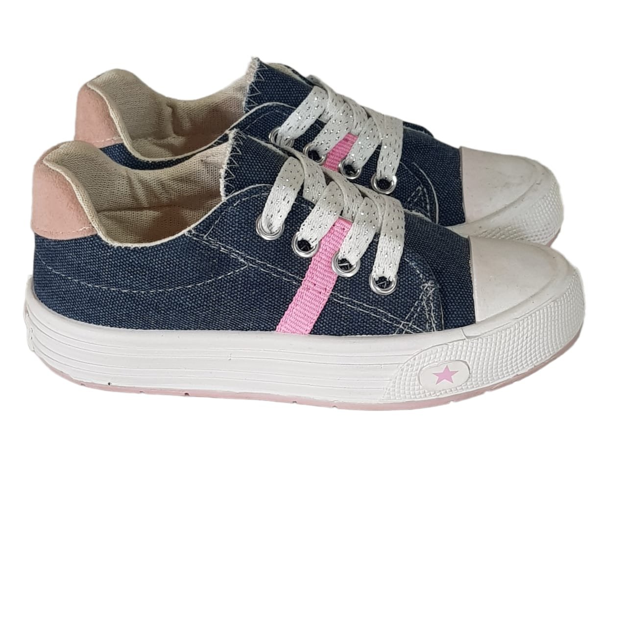 Zapatillas de lona y jean. Con ojales metálicos, cordones con lurex. Puntera y viro de goma liviana y flexible. Planta antideslizante.