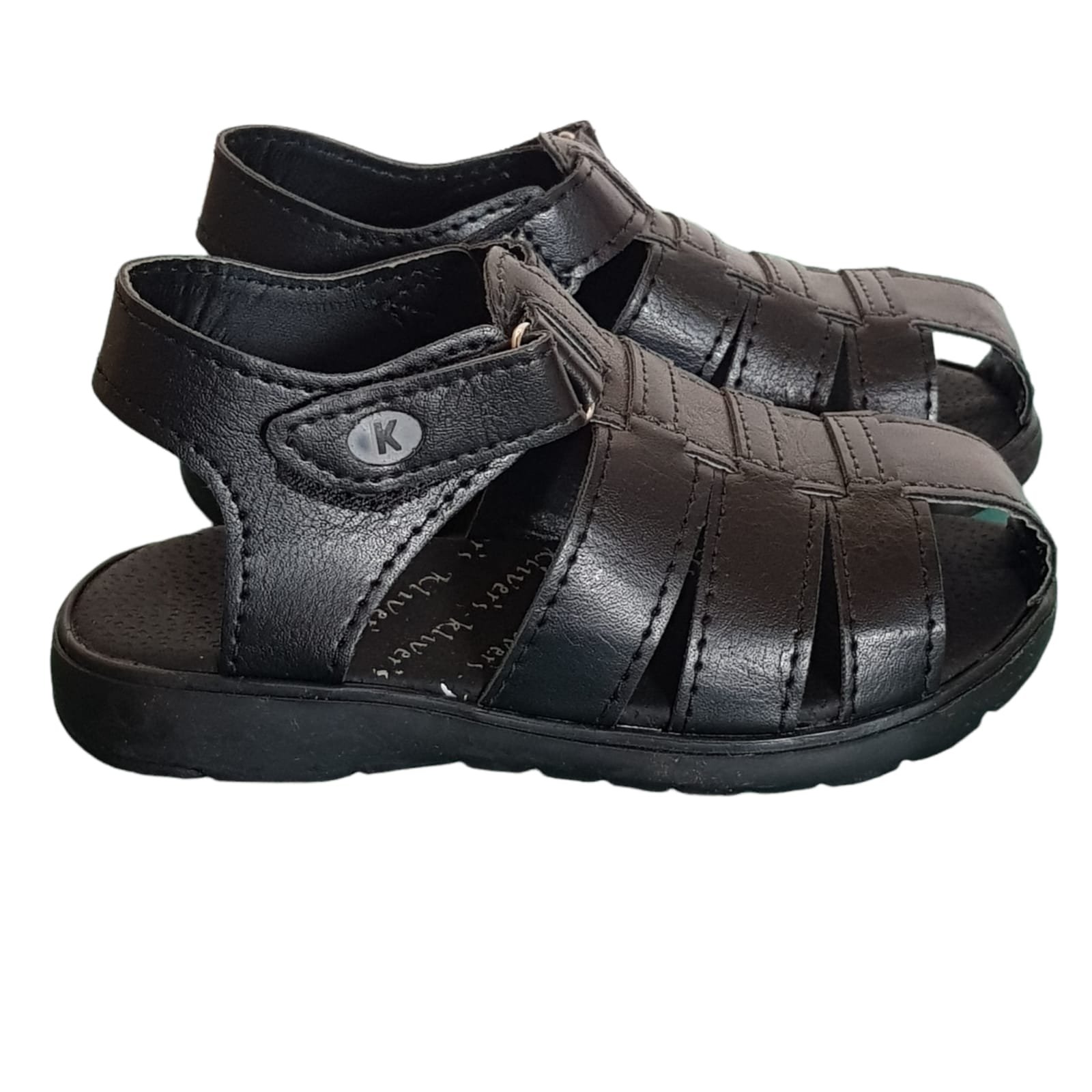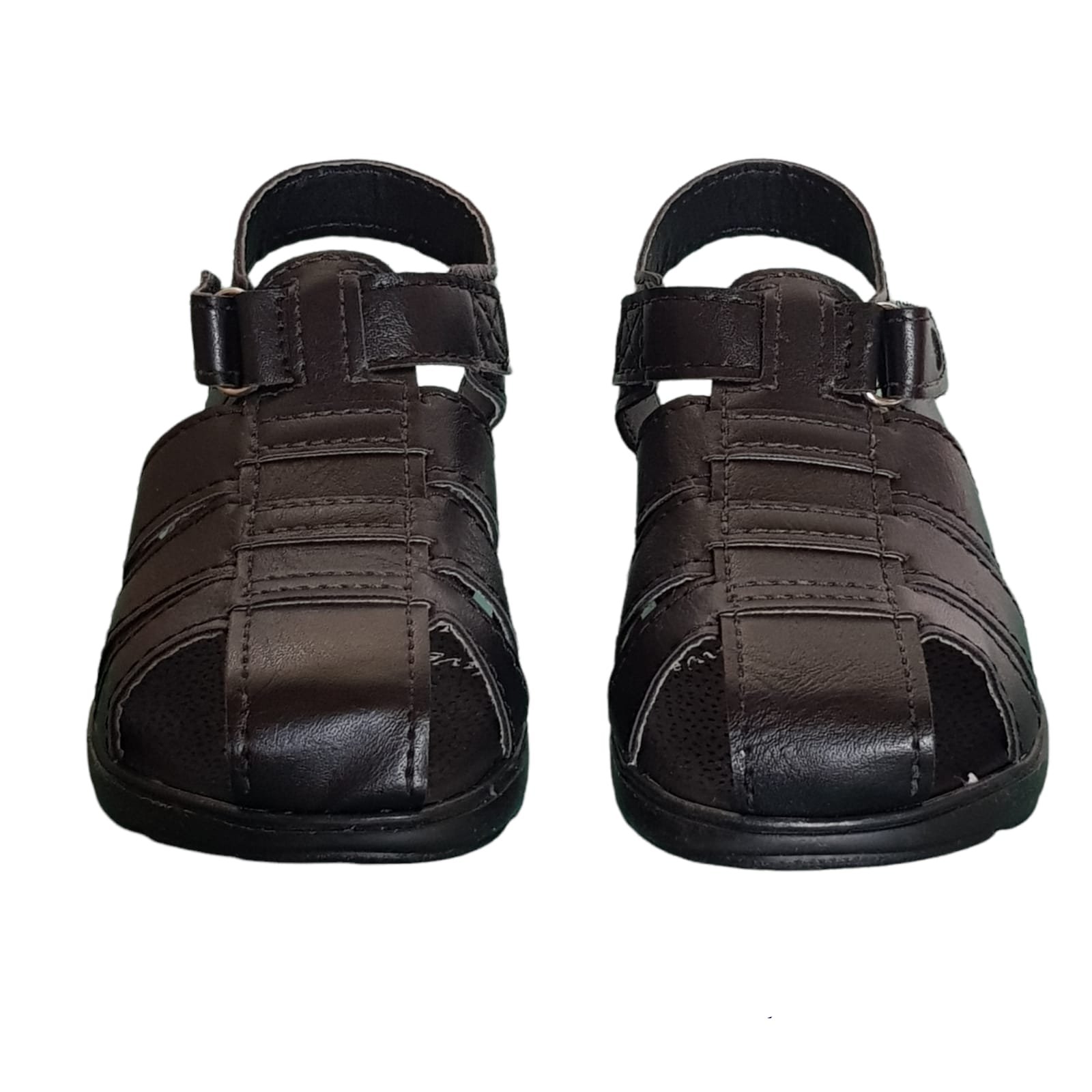 Franciscanas con hebilla y agarre de velcro. De material símil cuero con planta de goma liviana y flexible.