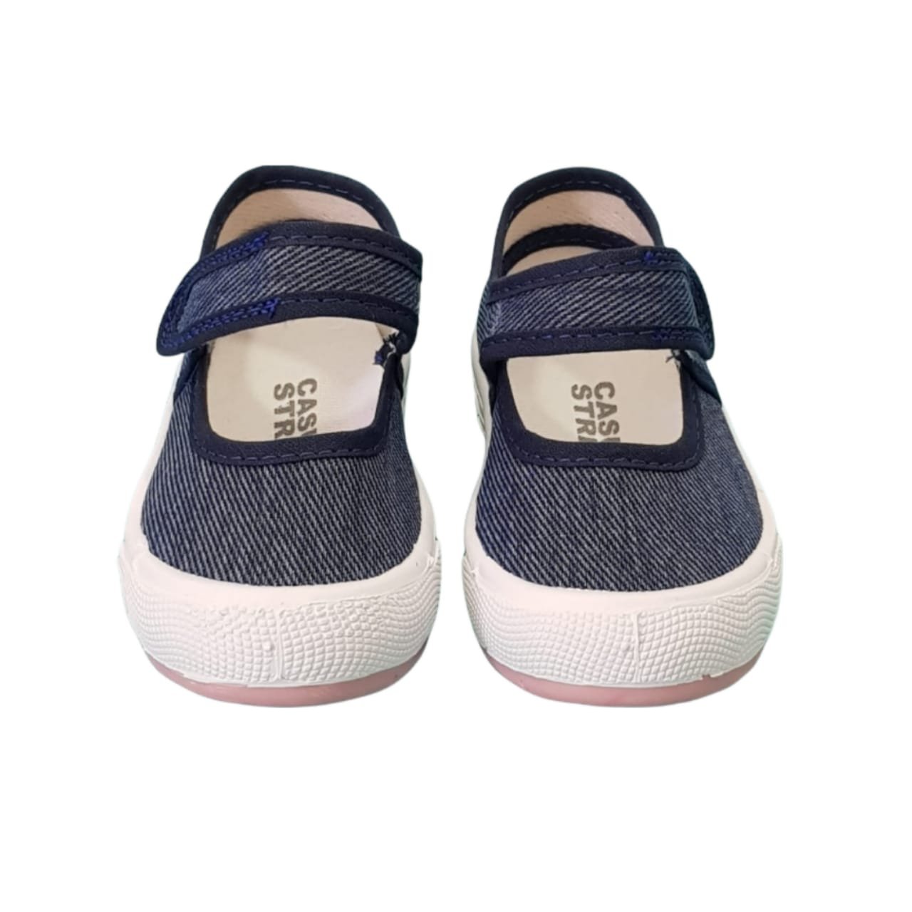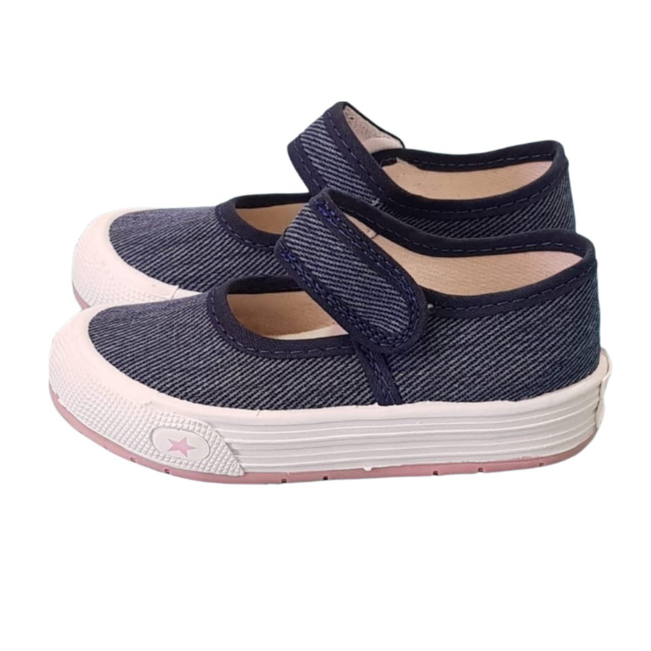 Guillermina de la línea casual babys and kids con planta de goma liviana y flexible. Capellada de lona jean con agarre de velcro.