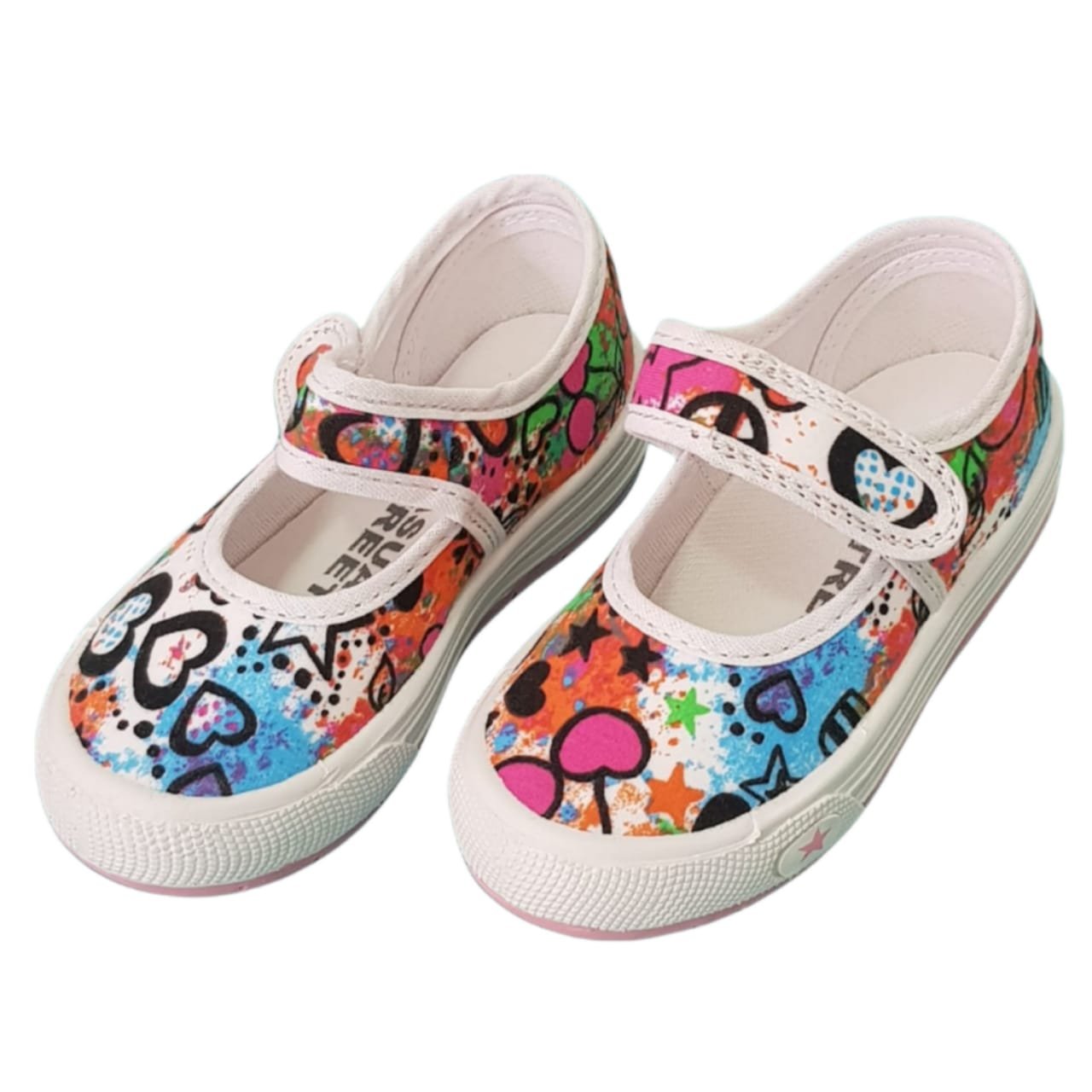 Guillermina línea casual kids. Confeccionada en lona full estampa y ribetes al tono. Planta de goma liviana y flexible. En color rosa.