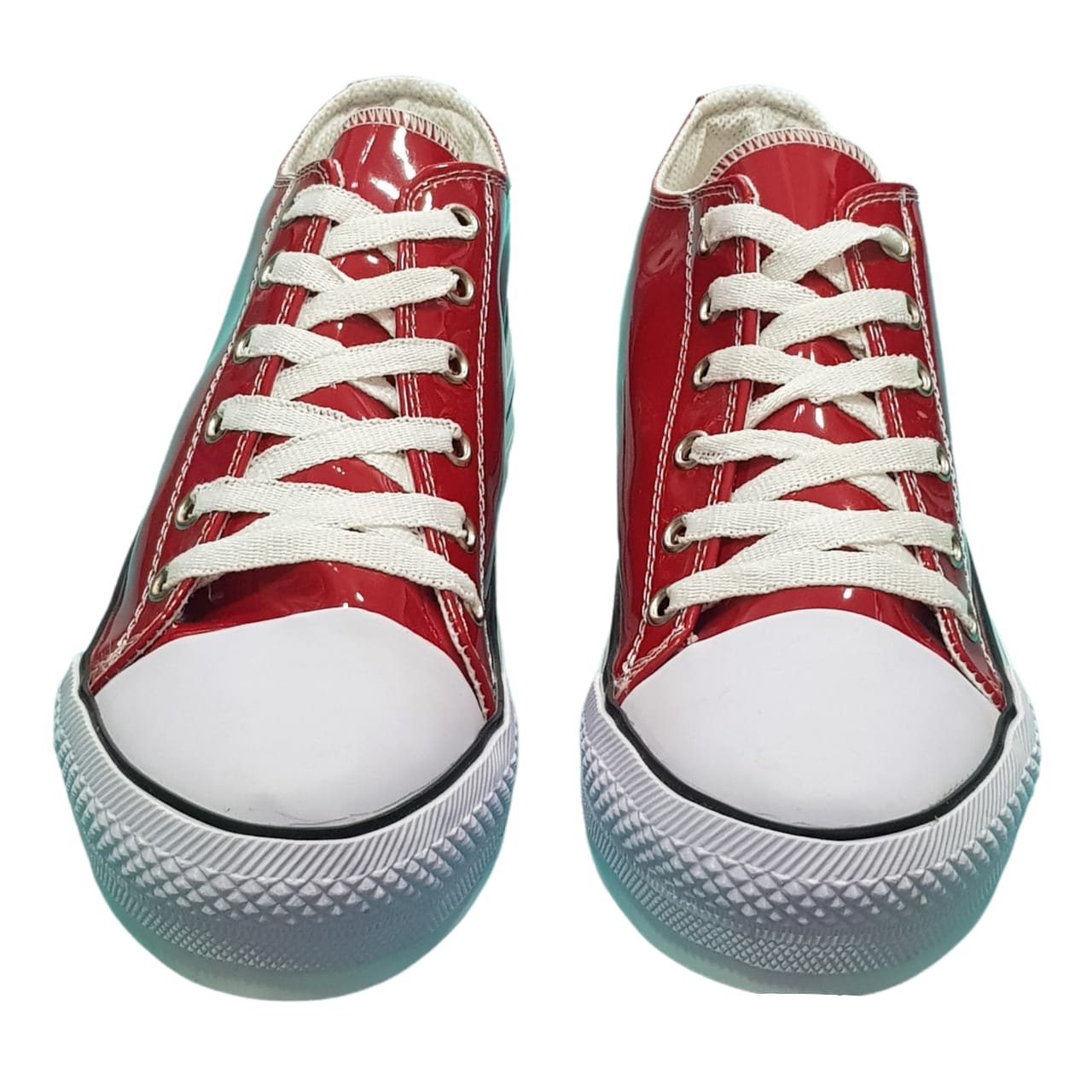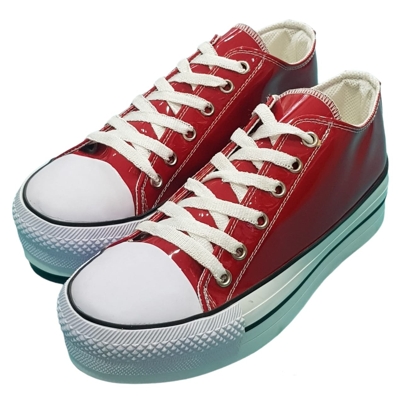Zapatillas capellada de charol rojo con cordón. Plataforma y puntera de goma.