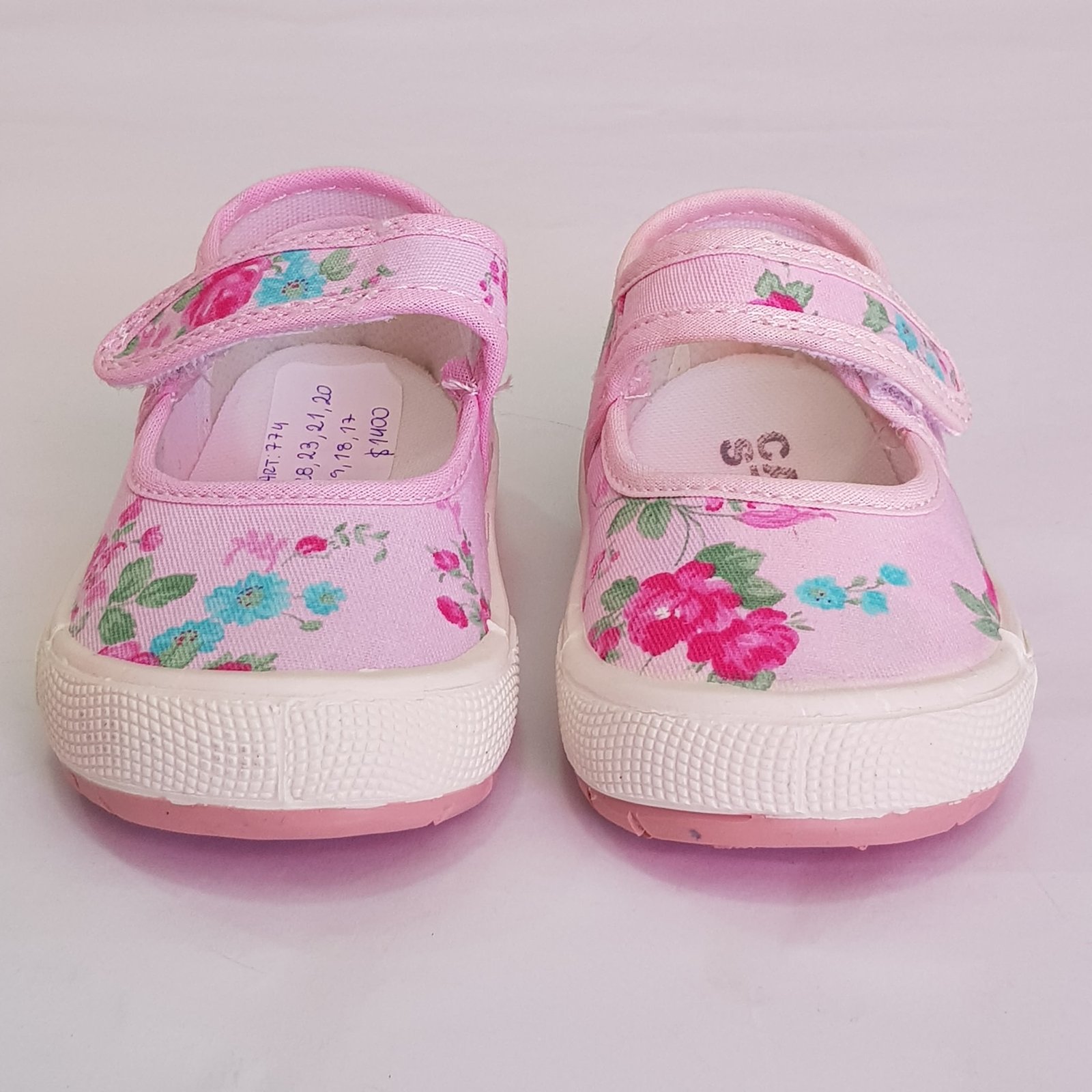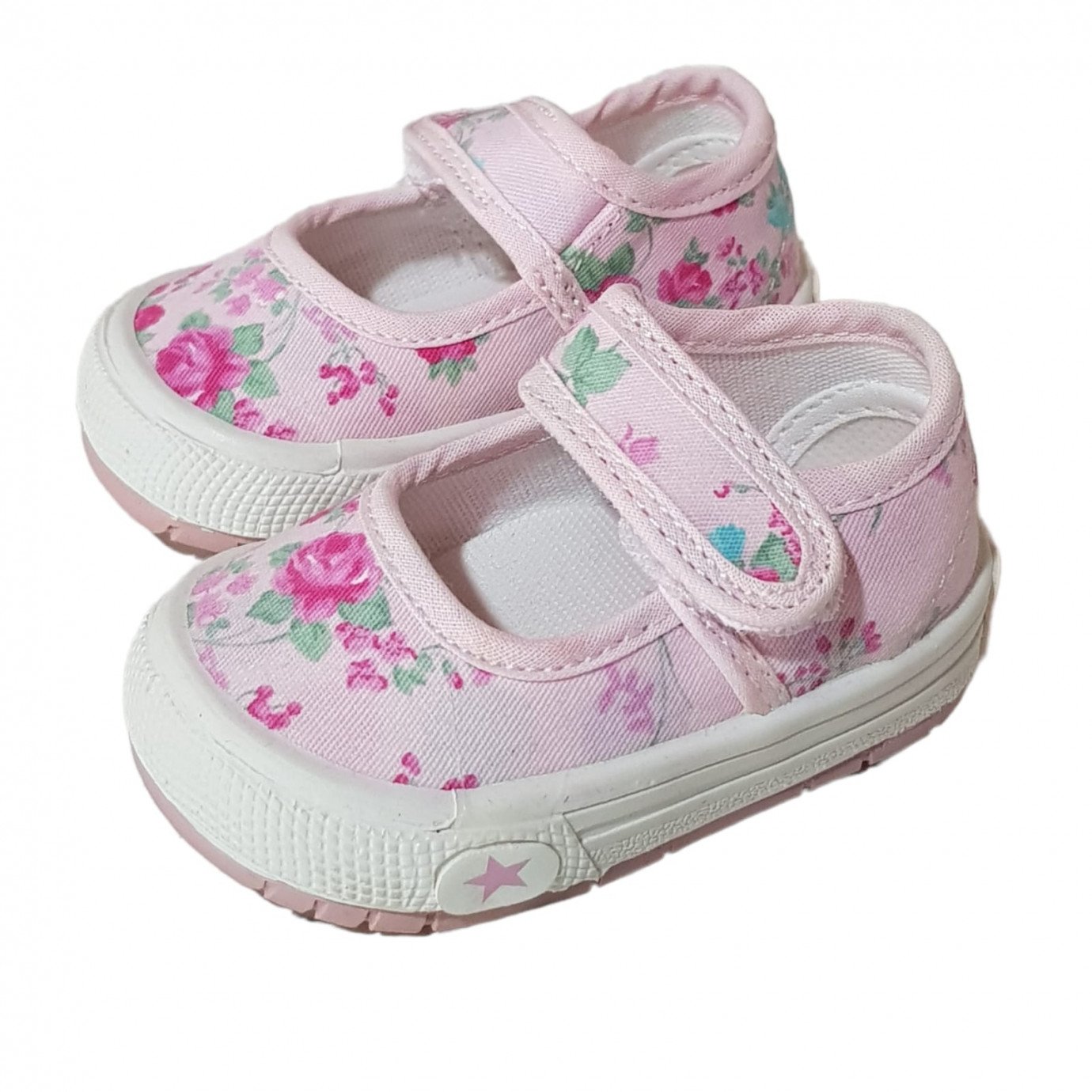 Guillermina baby línea casual. Con planta de goma liviana y flexible. Capellada de lona full estampa con ribete y pulsera con agarre de velcro.