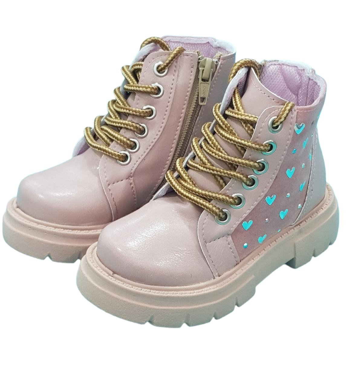 Borcegos simil cuero en color rosa con cordones y cierre lateral interno. Con detalle de cuero gamuzado y estrellas plateadas.