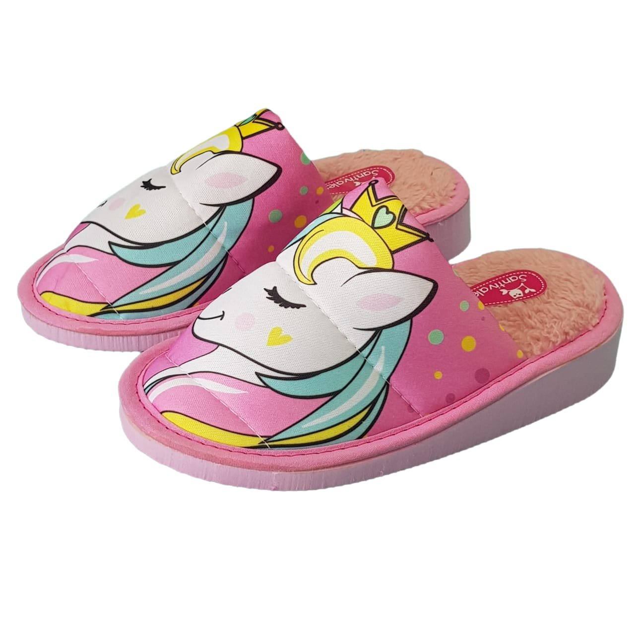 Pantufla sin talón con capellada sublimada. Interior con corderito y planta de goma liviana y flexible.