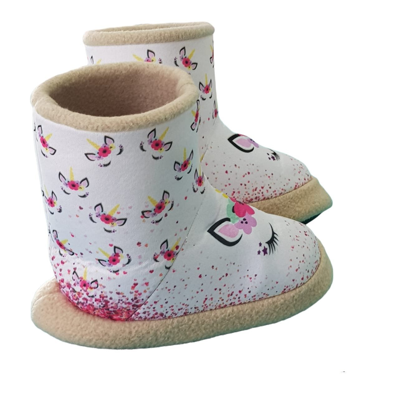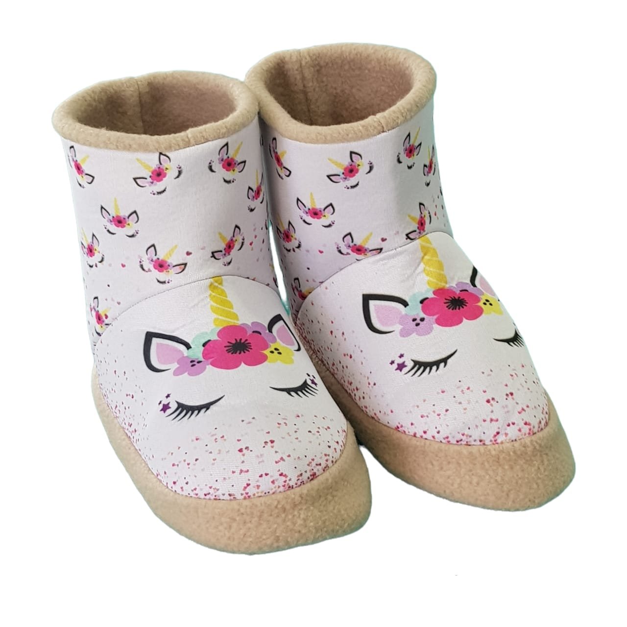 Pantufla caña alta de tela polar con estampa sublimada de personajes. Con planta de goma eva corrugada.