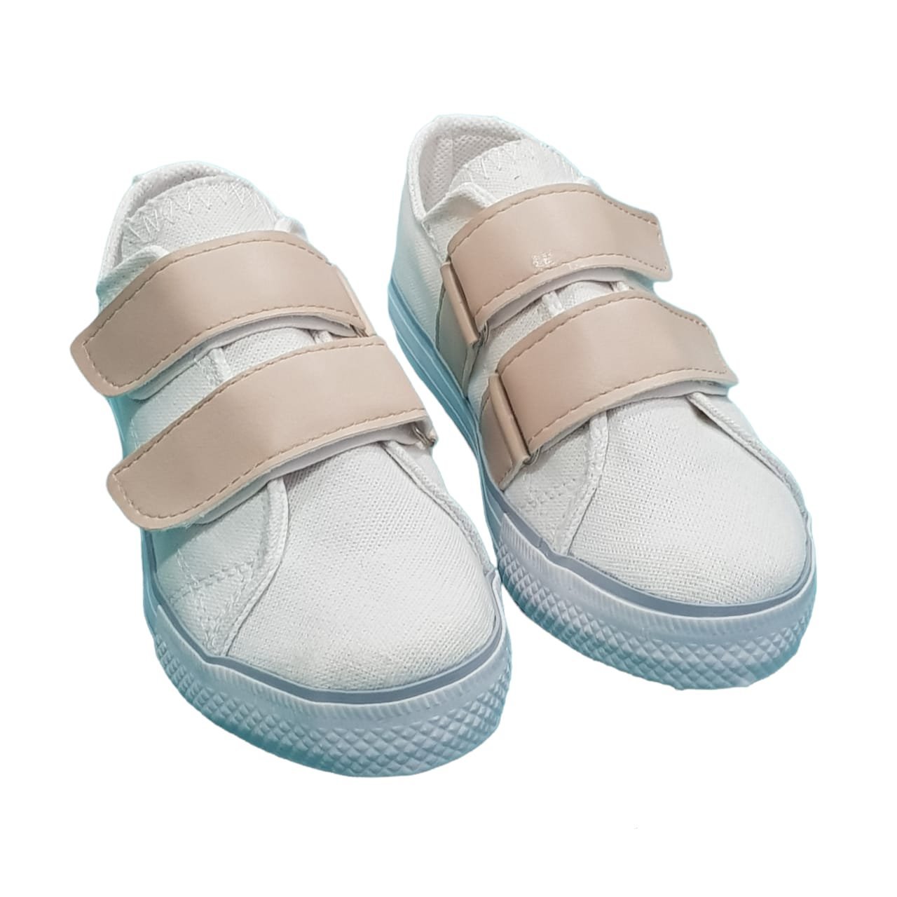 Zapatillas casual de lona con velcro en tono beige. Planta de goma liviana y flexible.