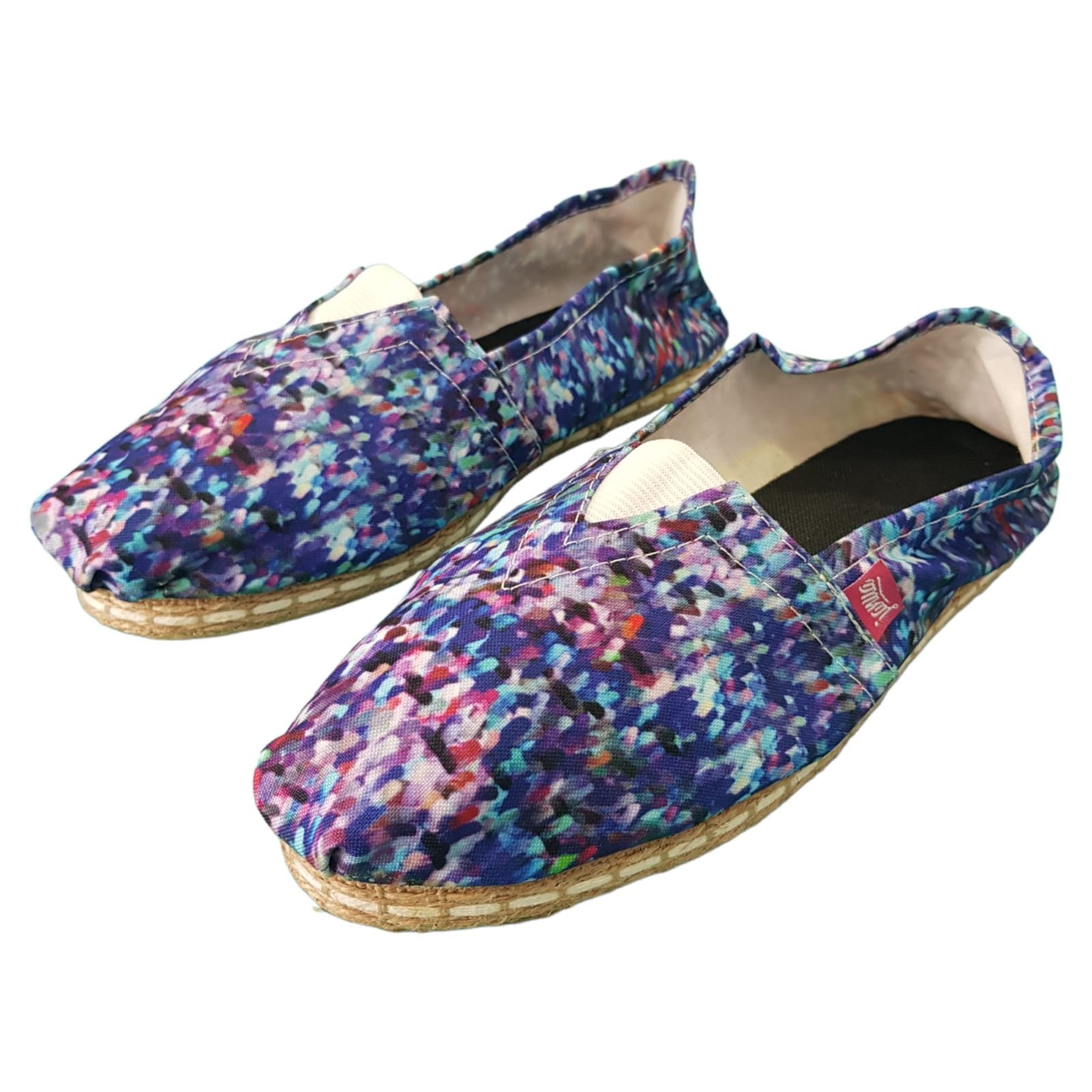 Alpargatas capellada de lona sublimadas, reforzadas con elastico, planta de goma con yute decorativo.