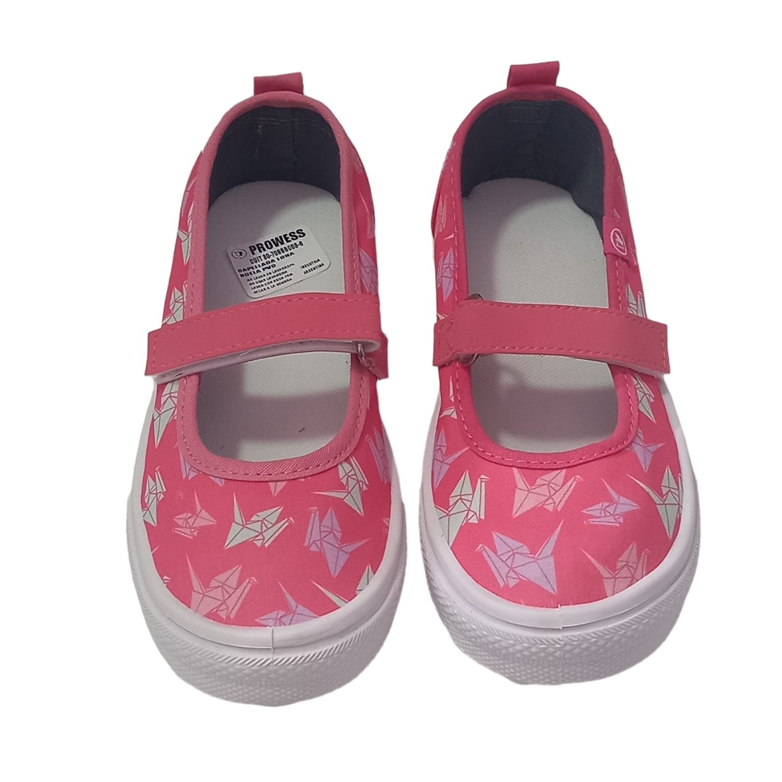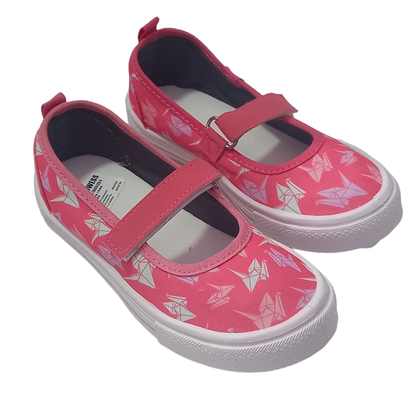 Guillermina planta de goma, liviana y flexible. Con capellada de lona sublimada, ribetes coral y pulsera con velcro regulable.