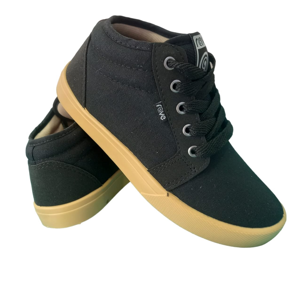 Zapatillas casual media caña de lona color negro. Acordonada de planta liviana y flexible color caramel.