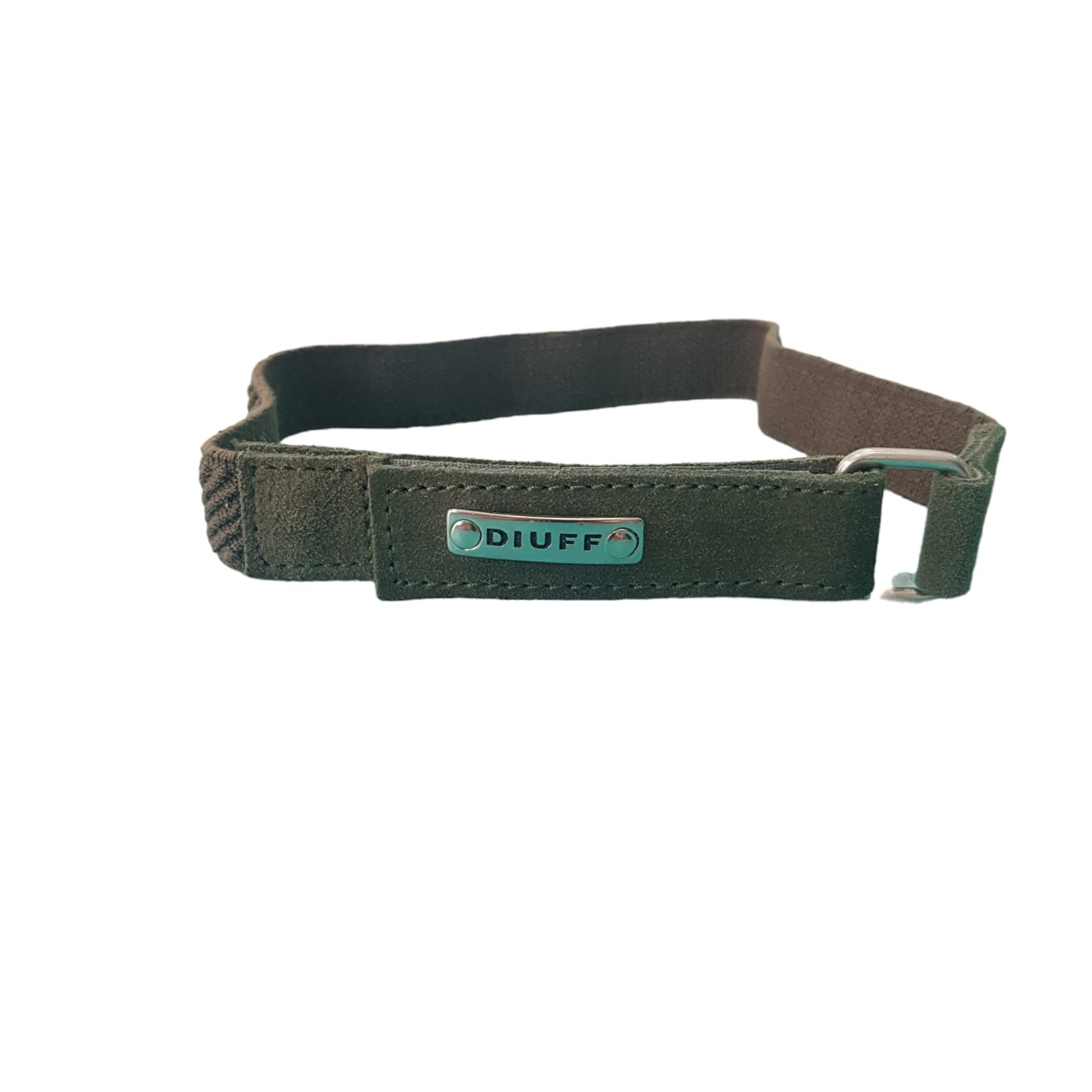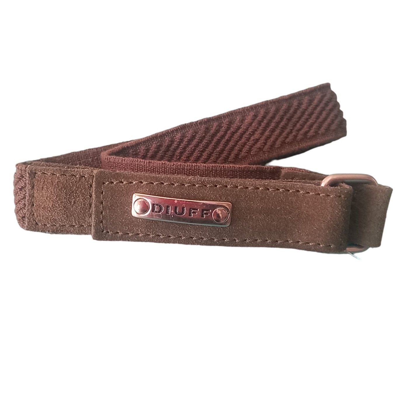 Cinto elástico con delantera de cuero y agarre con velcro.