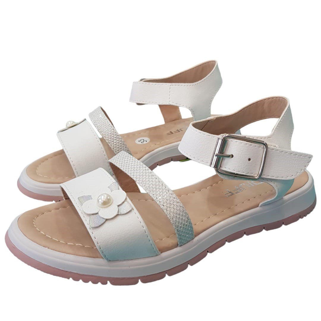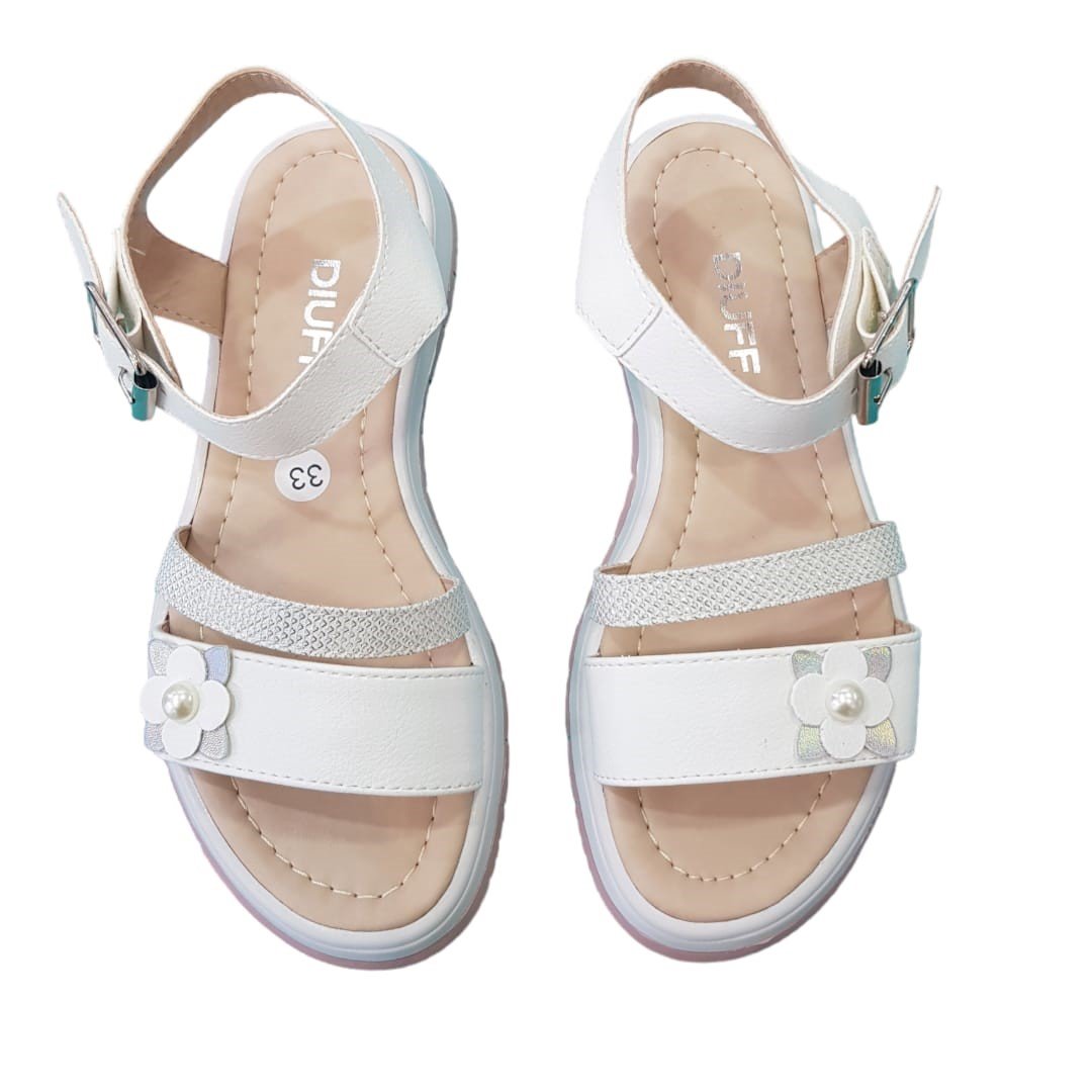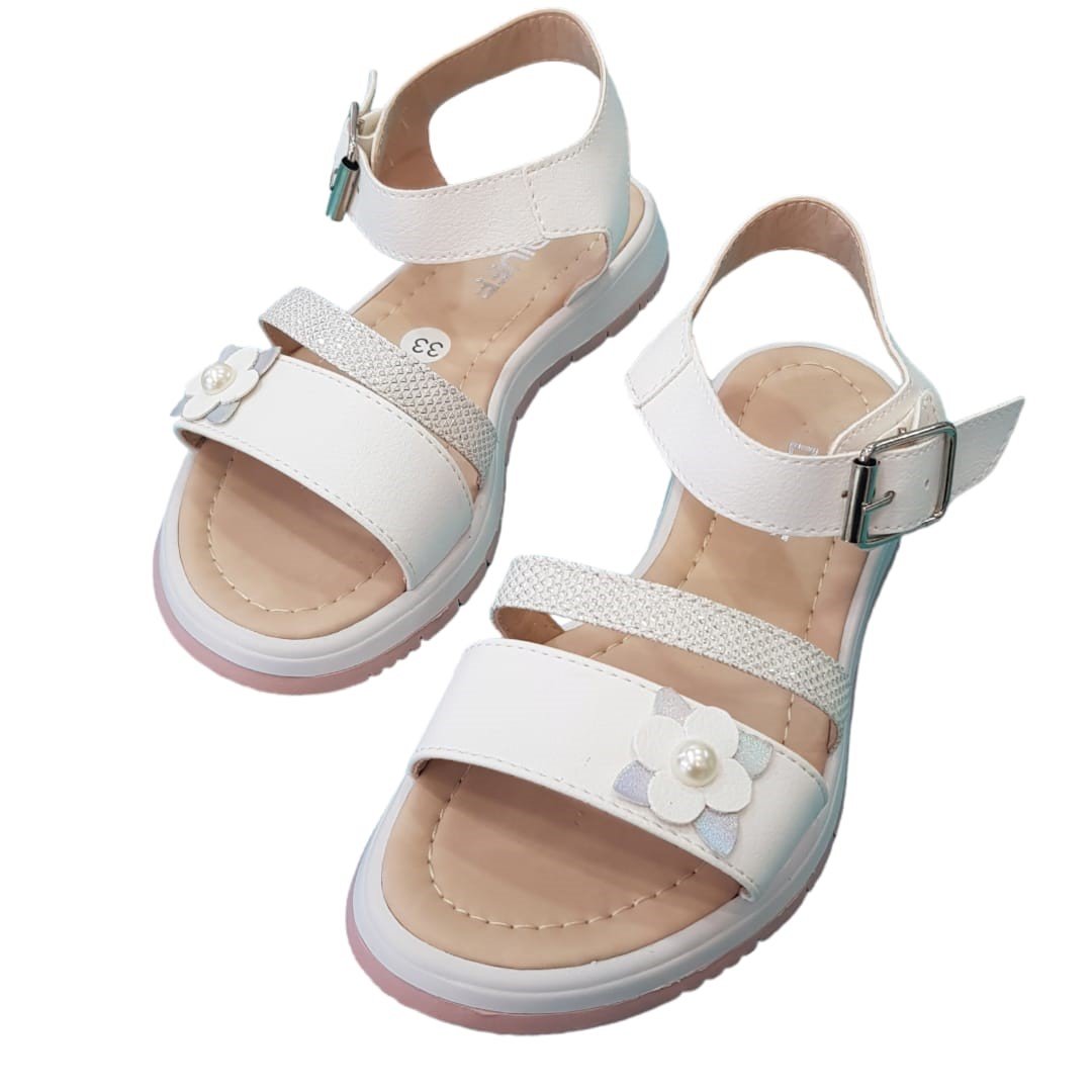 Sandalias símil cuero con detalles. Capellada en tiras combinada en blanco, plata y lurex plata. Pulsera con agarre en hebilla regulable. Planta soft y suela de goma super flexible acanalada.