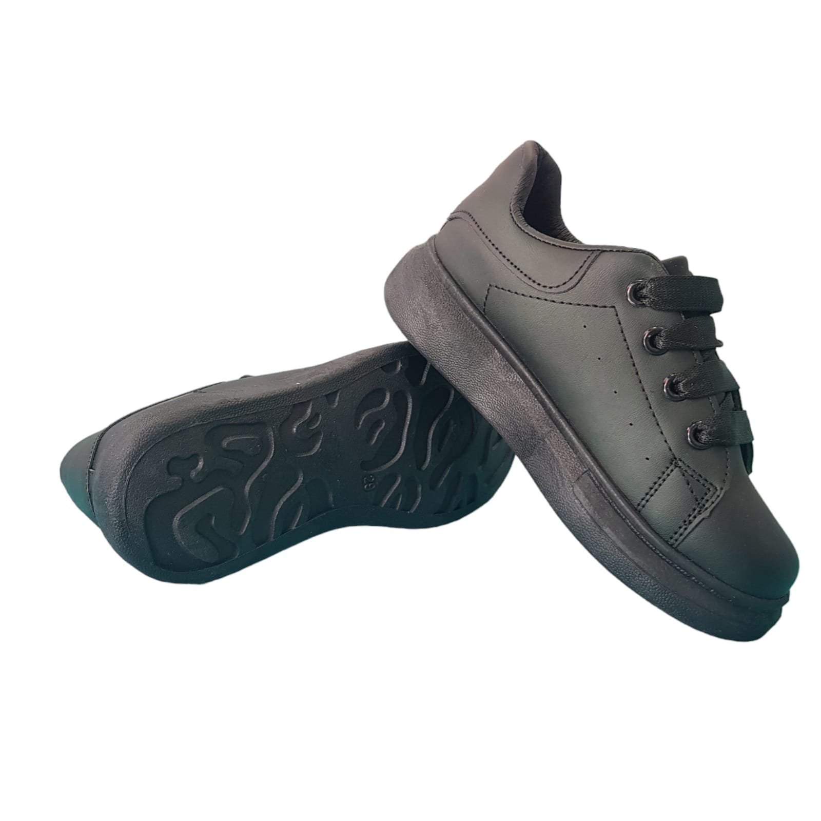 Zapatilla capellada de simil cuero, con cordones, con detalles en negro.