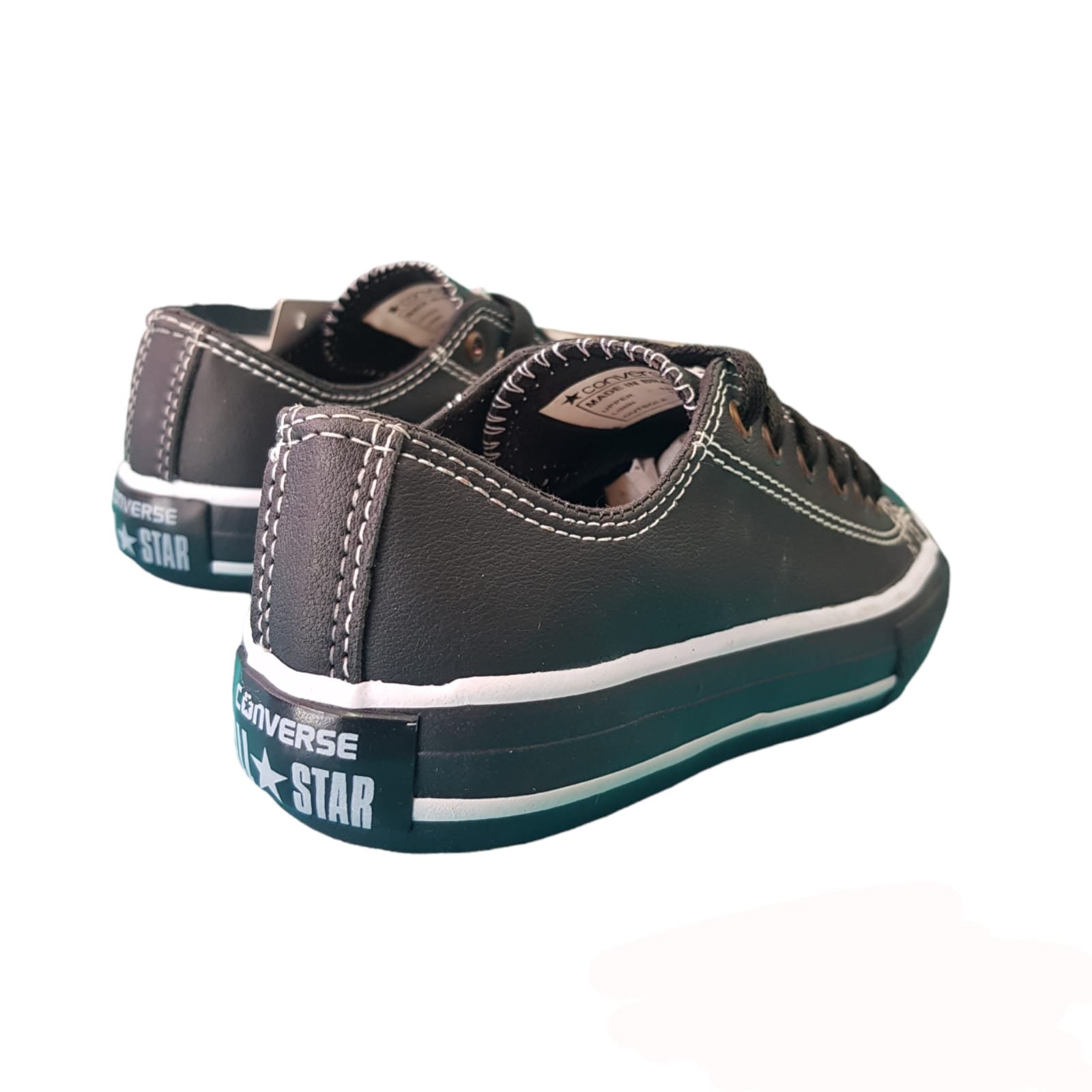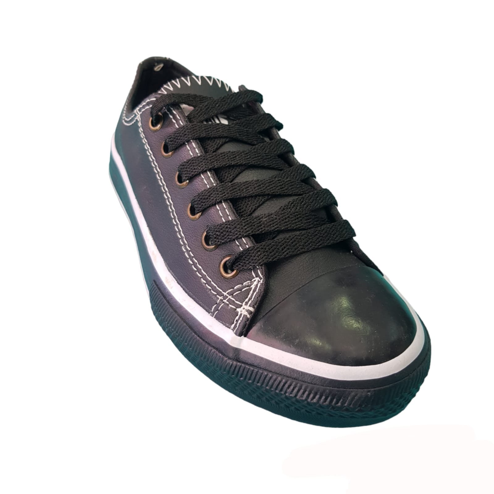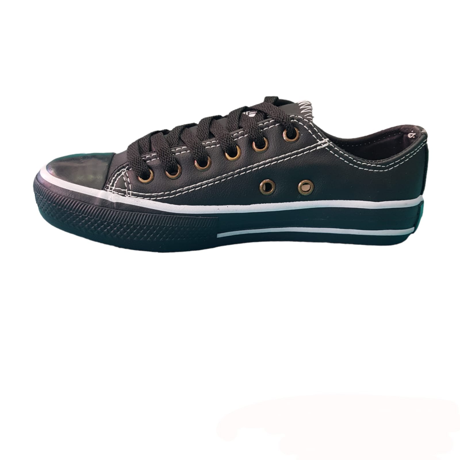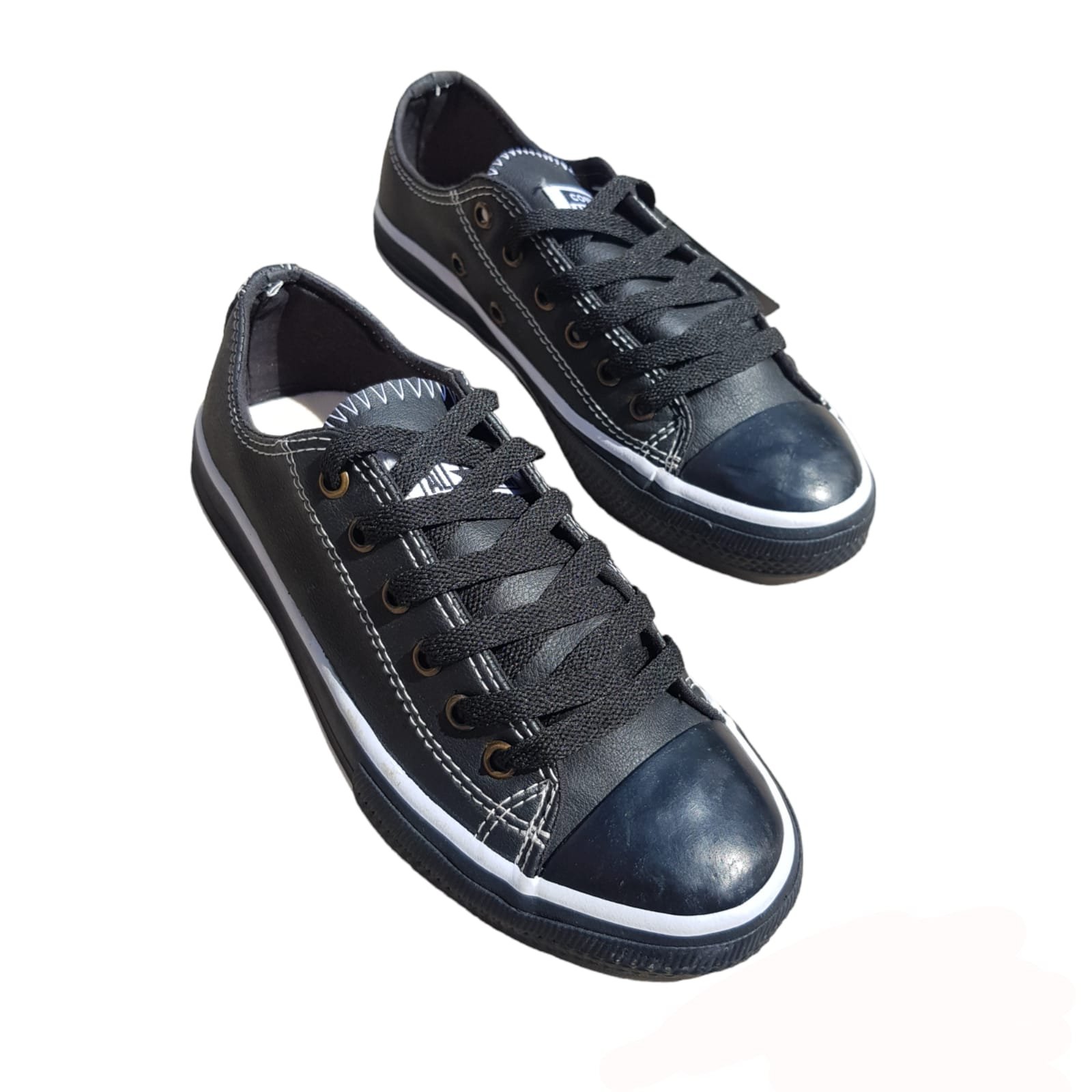 Zapatillas caña baja. Capellada de eso cuero. Cordones de polyester. Ojalillos metálicos. Vira, puntera y suela de caucho.
