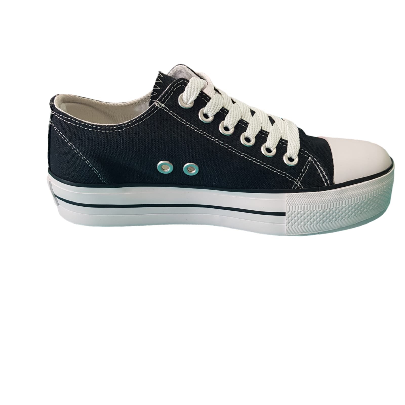 Zapatillas con plataforma, puntera y banda de goma. Capellada de lona negro. Acordonada con pasajes metálicos.