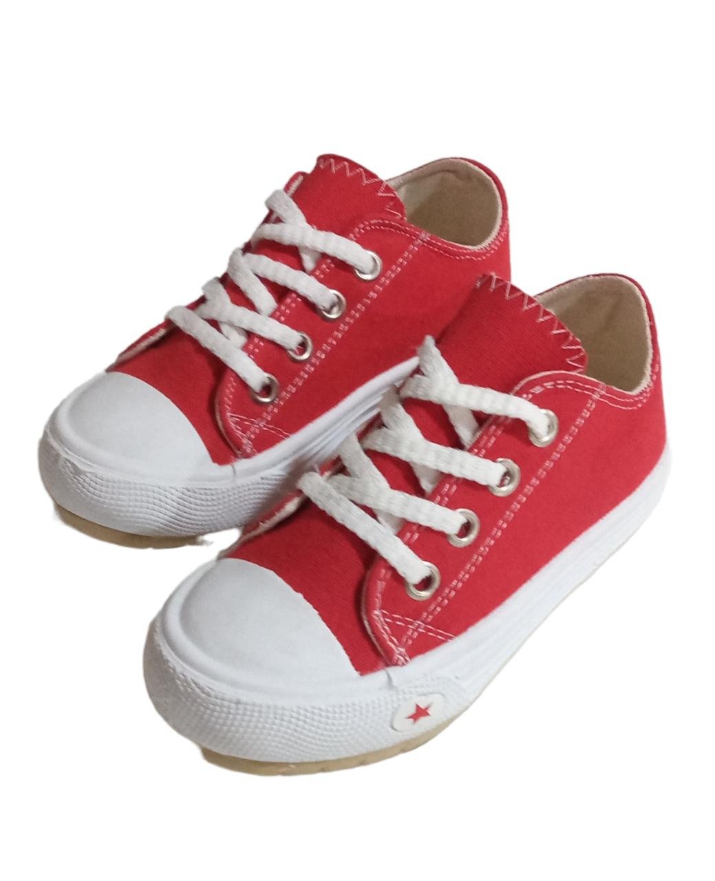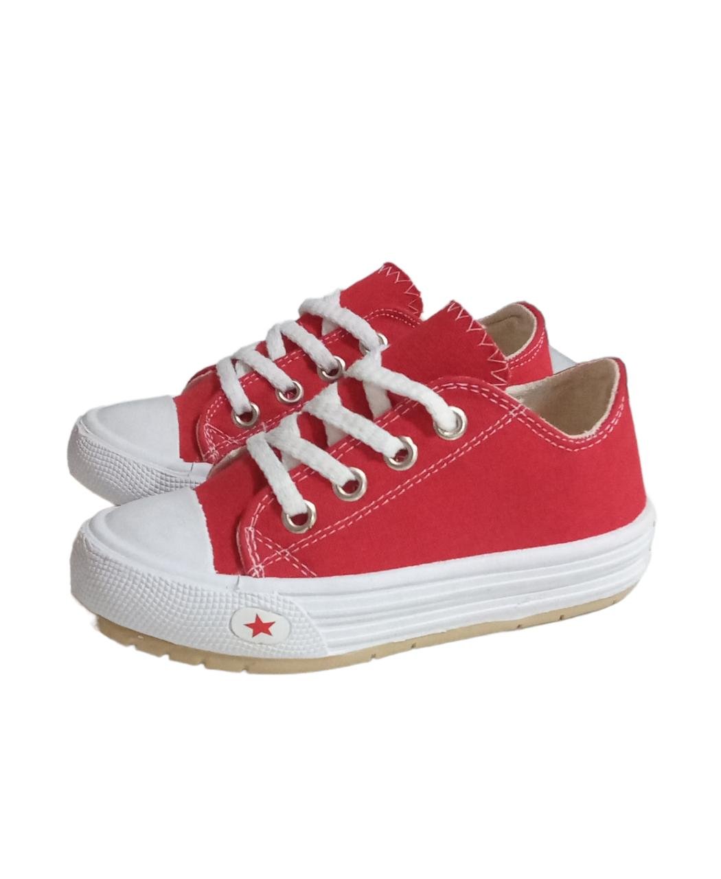 Zapatilla con capellada de lona color rojo y cordones. Planta y puntera de goma flexible, antideslizante y liviana.