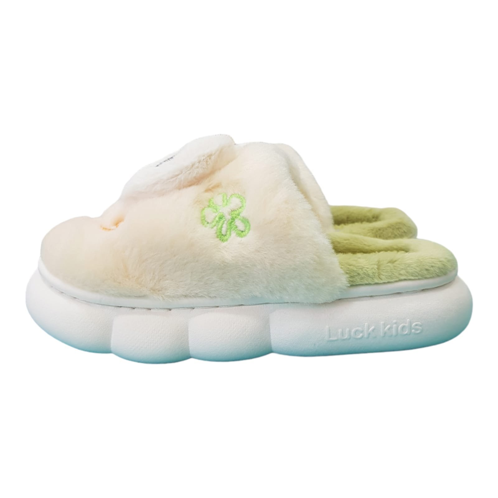 Pantufla destalonada con interior y capellada de peluche con ojitos grandes. Planta alta de goma liviana.