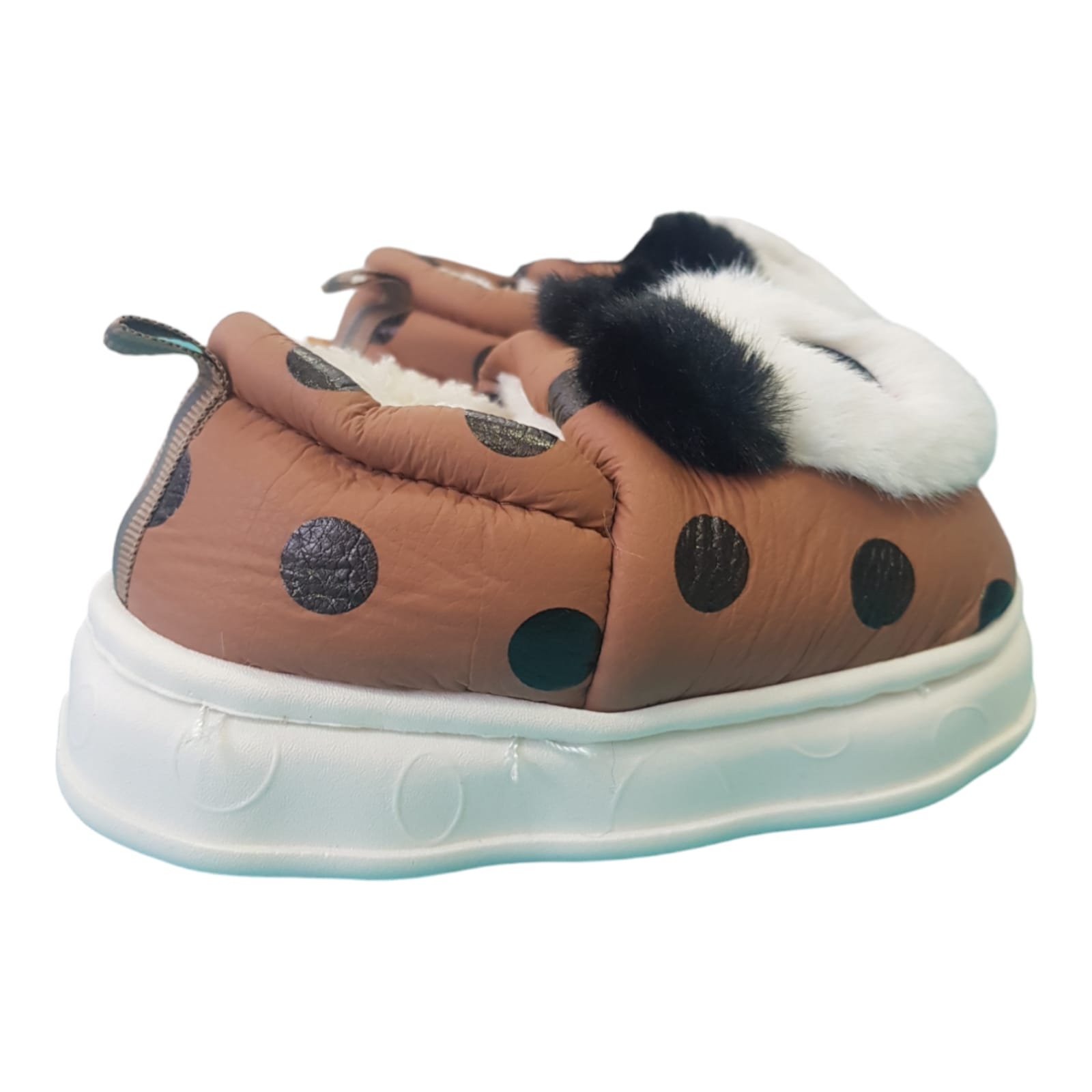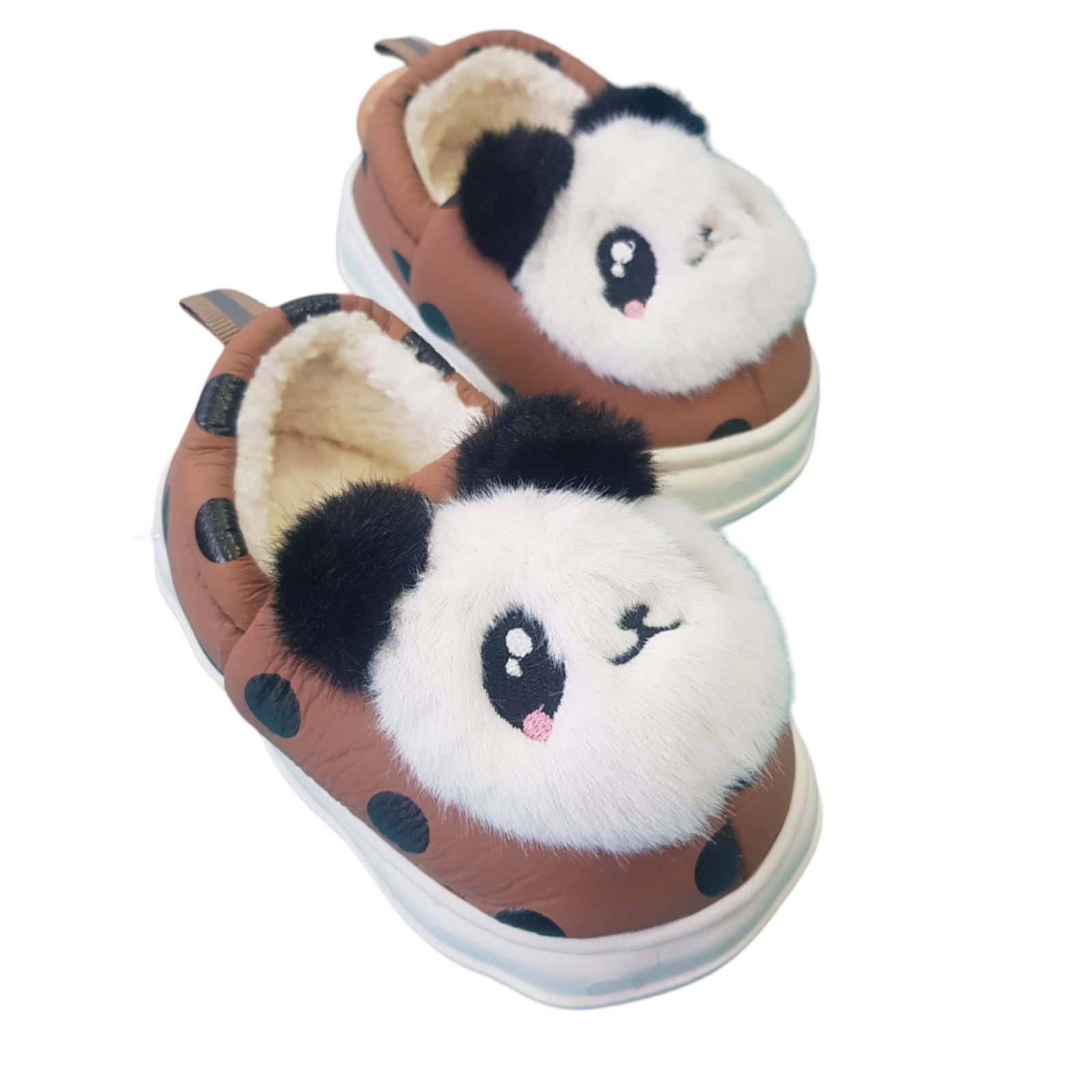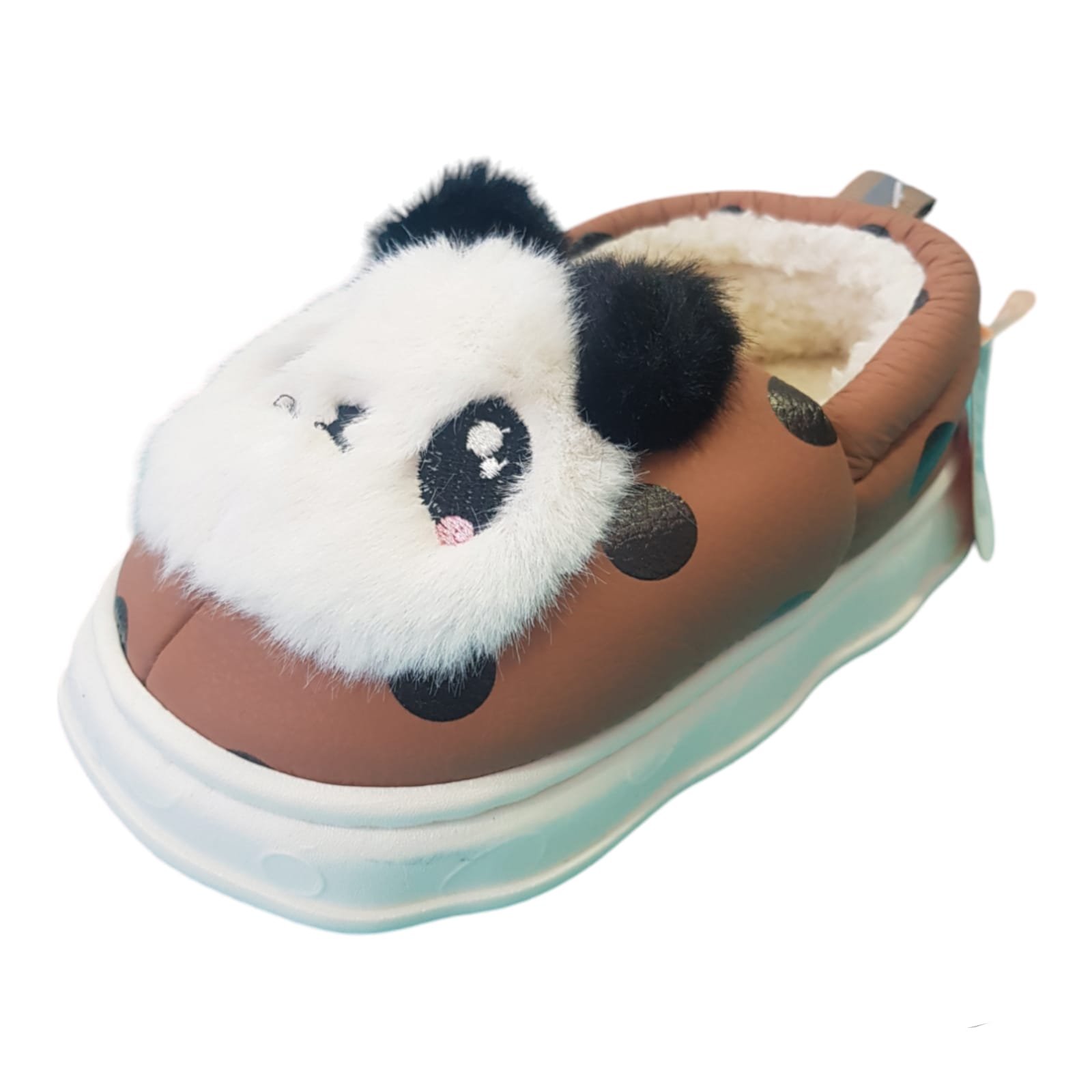 Pantufla cerra con peluche en el interior. Capellada de símil cuero estampado. Aplique de peluche en forma de cara de panda. Planta alta de goma liviana.