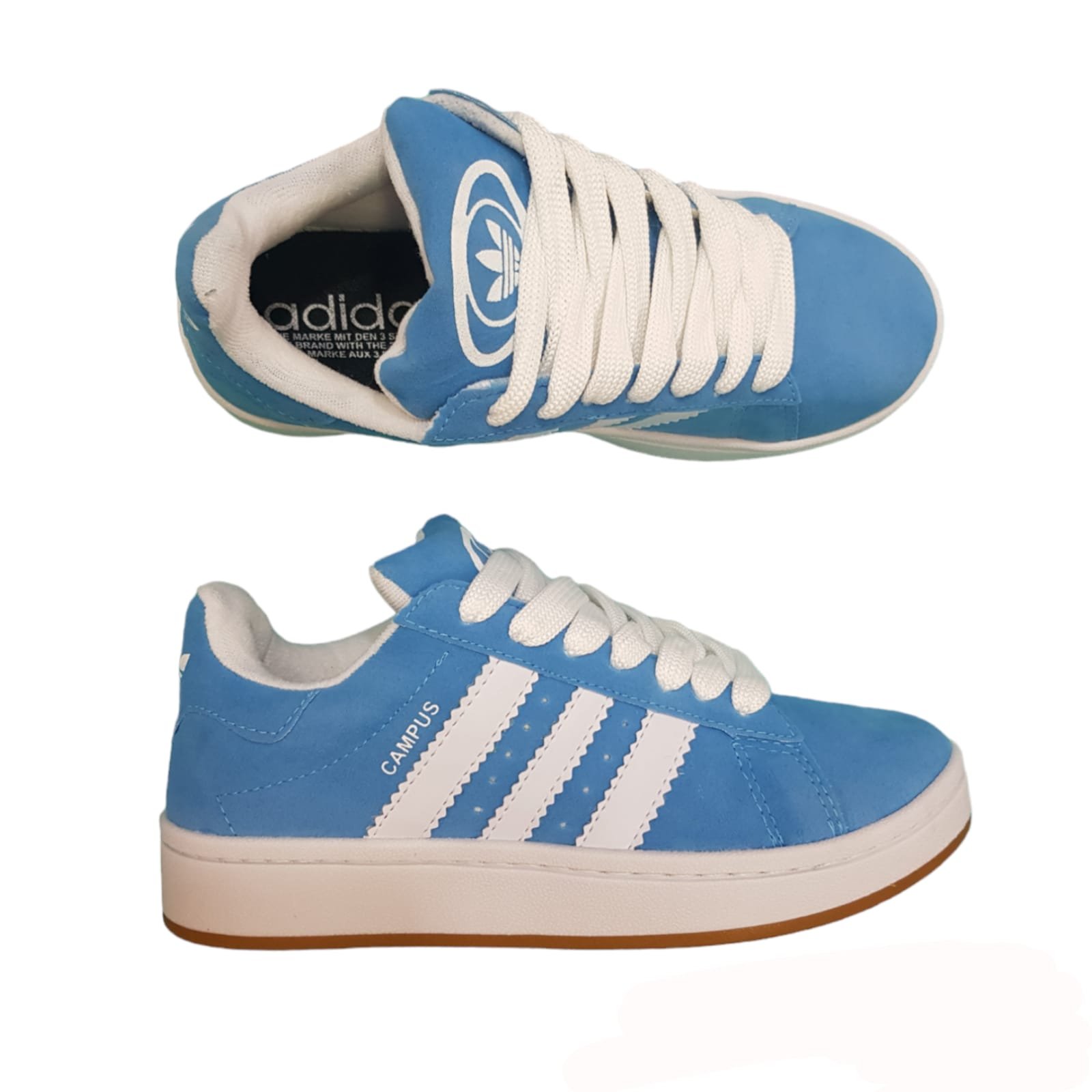Zapatillas acordonadas. Capellada de material sintético gamuzado color celeste. Con planta de goma liviana y flexible.