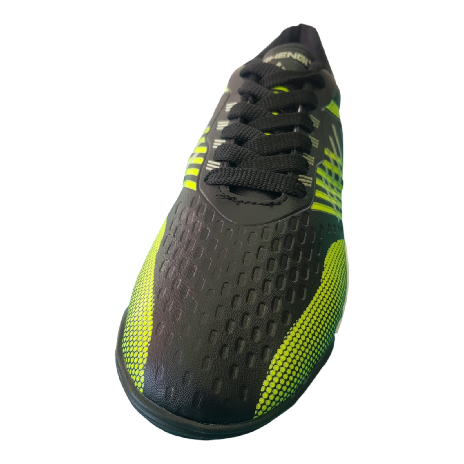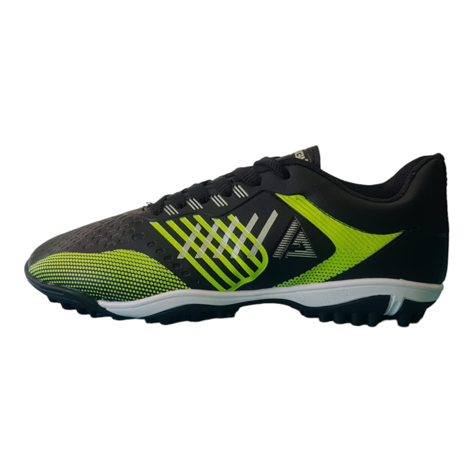 Botines fútbol 5 con capellada de material símil cuero. Con cordones de algodón. Planta de goma dentada, resistente y liviana.