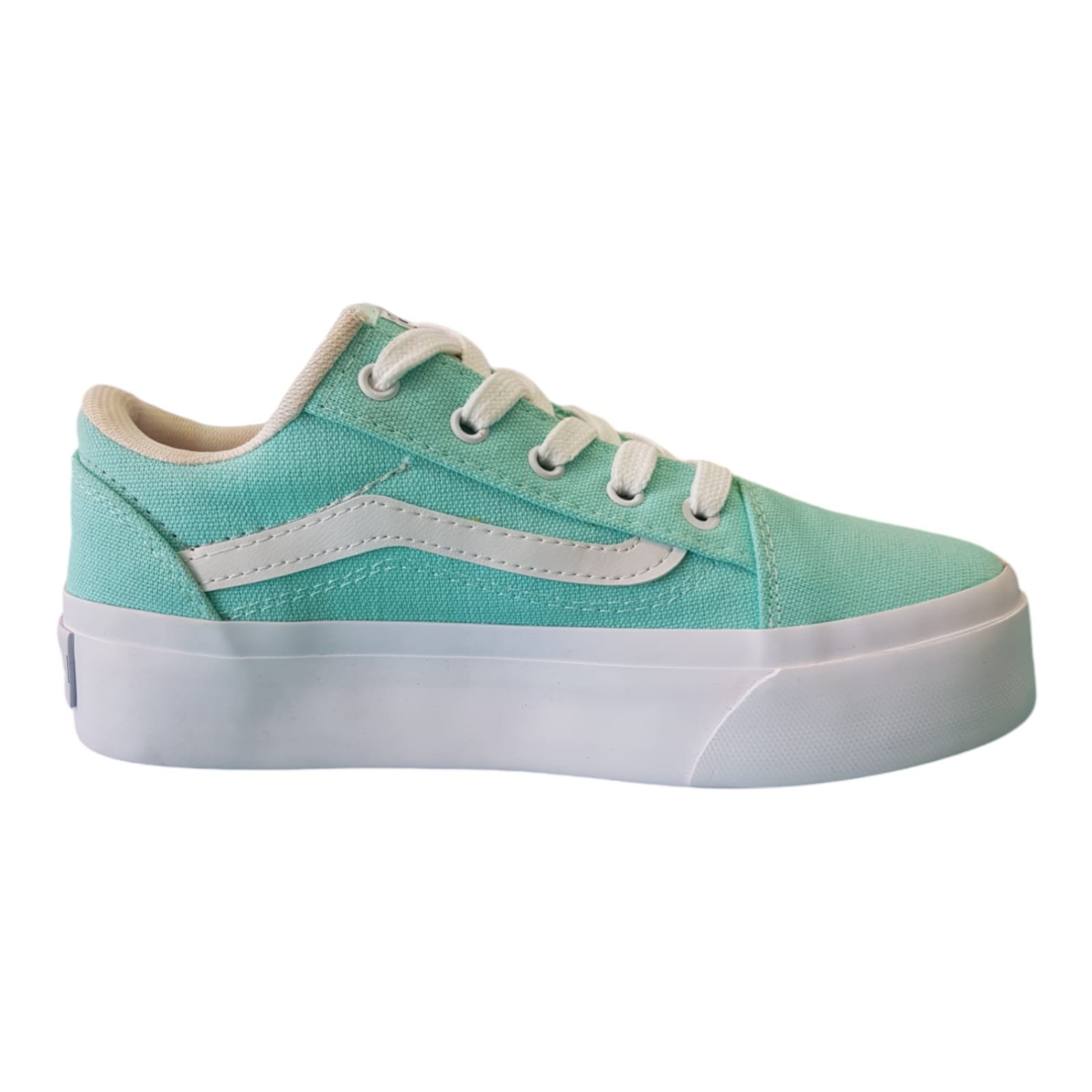 Zapatillas de lona color aqua. Con cordones de algodón, viro ancho blanco de caucho y planta wafle color caramelo.