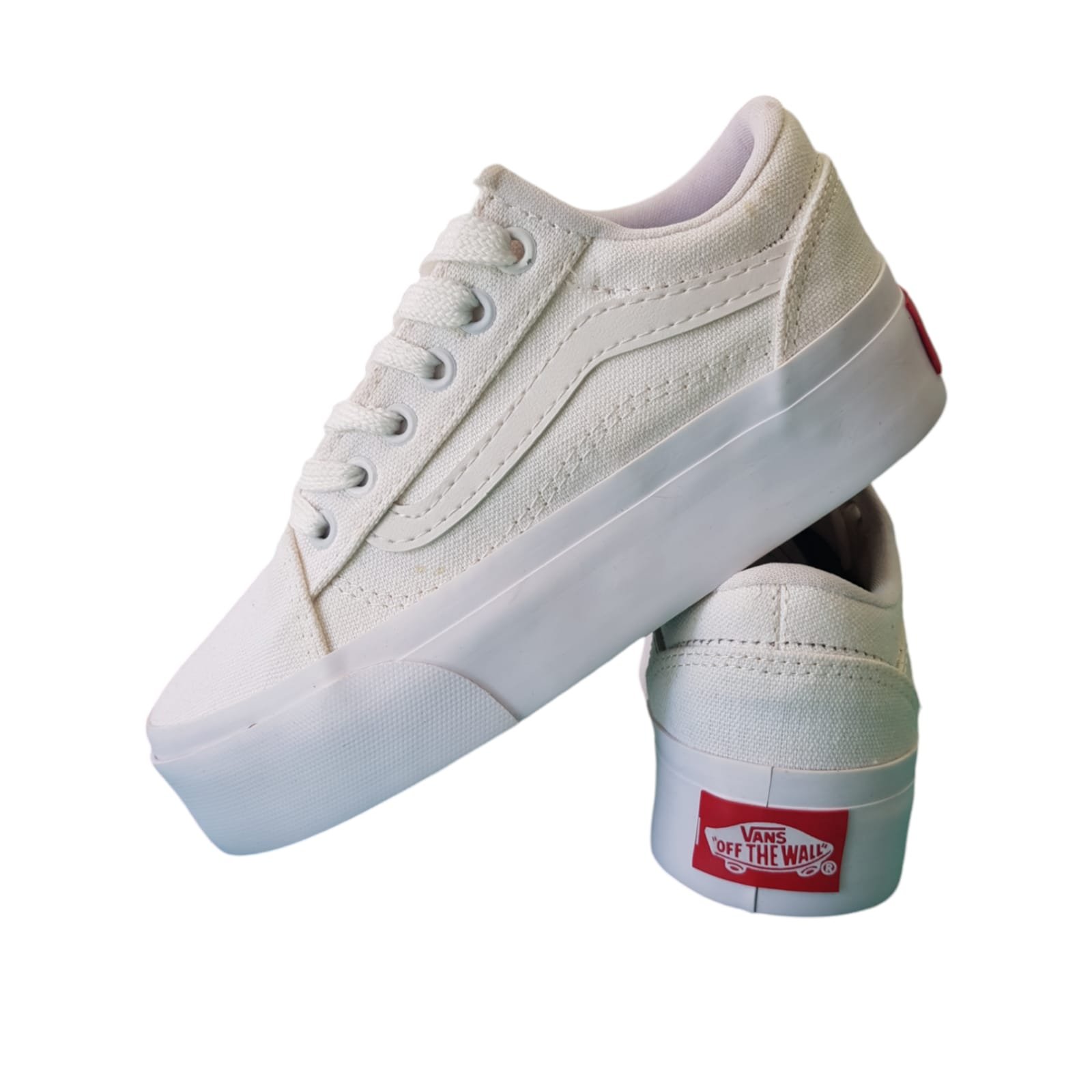 Zapatillas de lona color blanco con cordones de algodón. Viro ancho de caucho y planta wafle color caramelo.