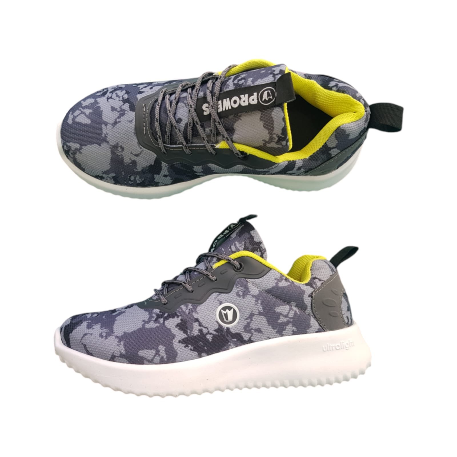 Zapatillas deportivas de planta ultra light. Livianas, flexibles y resistentes. Con capellada camuflada y acordonada.