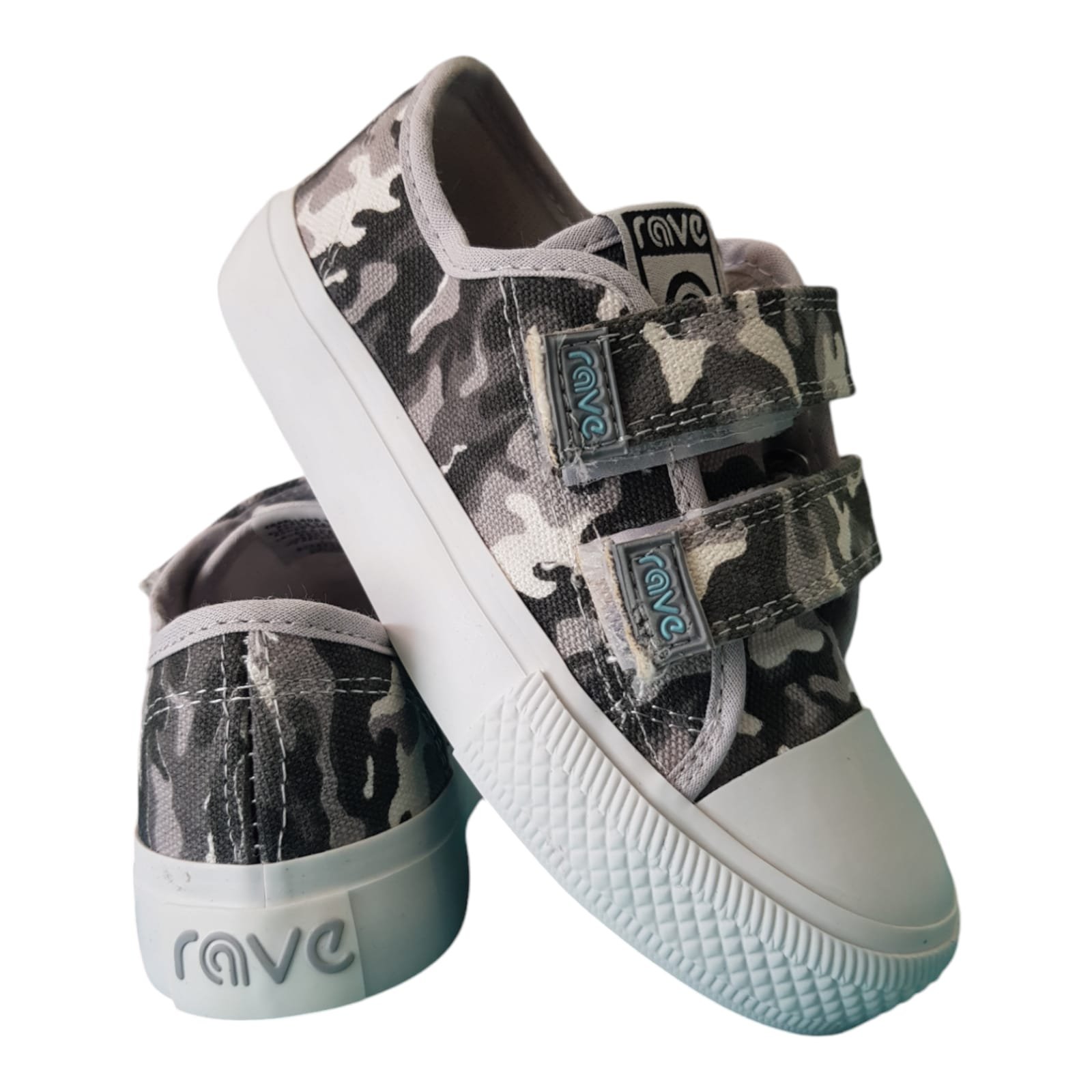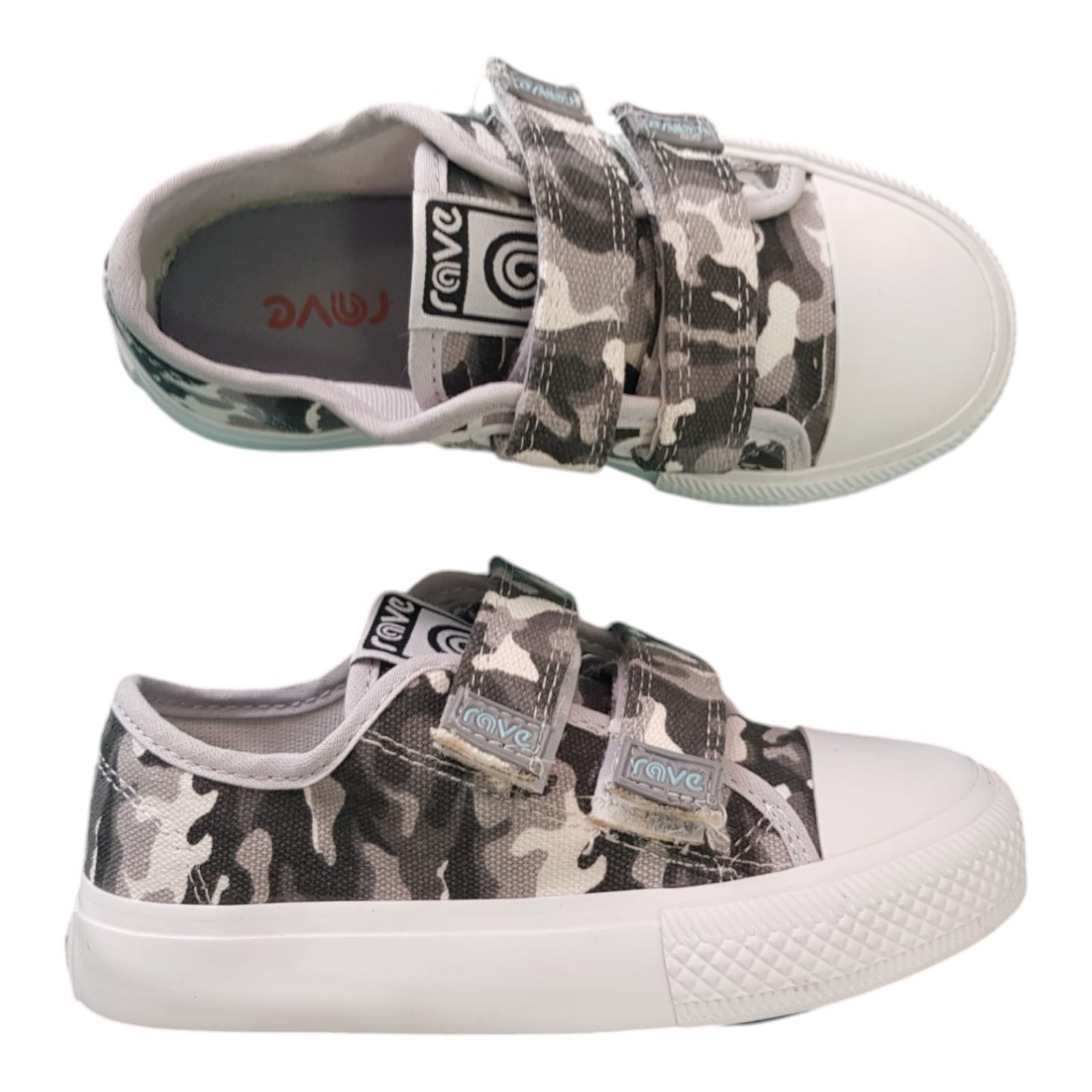 Zapatillas línea kids. Confeccionada con lona resistente camuflada. Ajuste de doble velcro con puntera y viro de goma. Planta de caucho liviano y flexible.