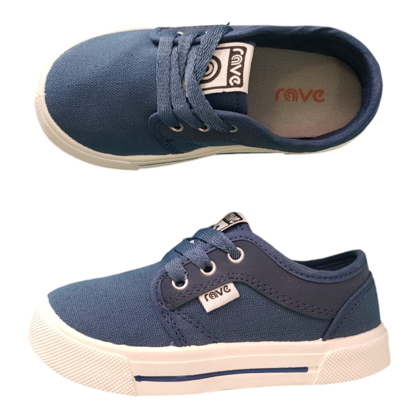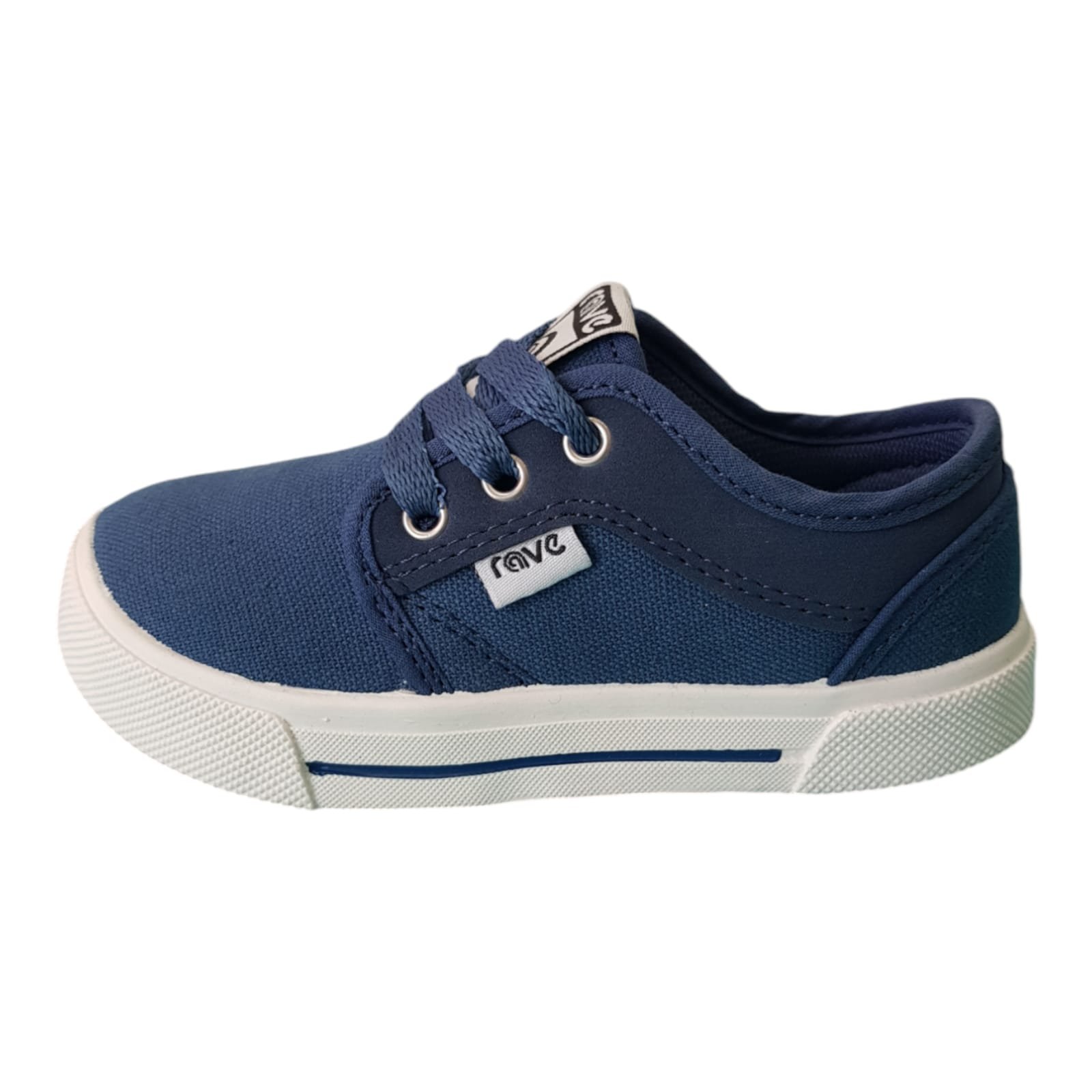 Zapatillas de la línea baby con cordones de nylon, capellada de lona azul resistente con ribetes al tono. Planta de goma liviana y flexible.