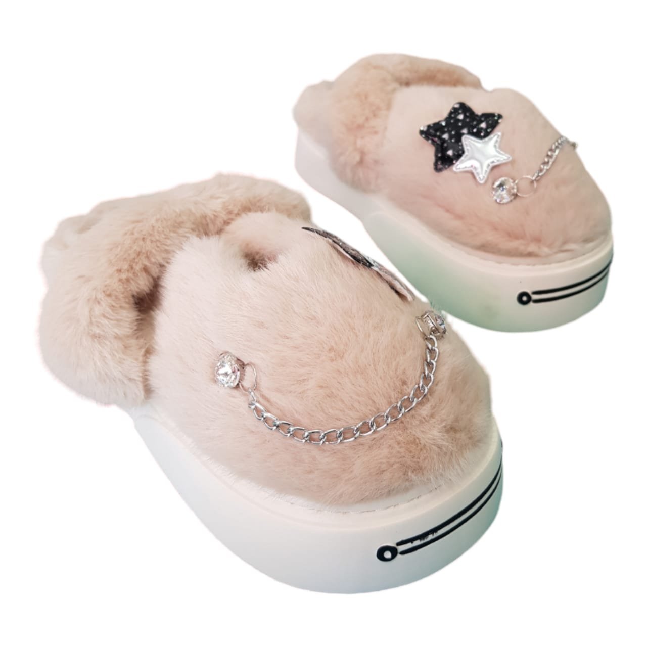 Pantufla destalonada teens con plataforma. Capellada apeluchada con accesorios.