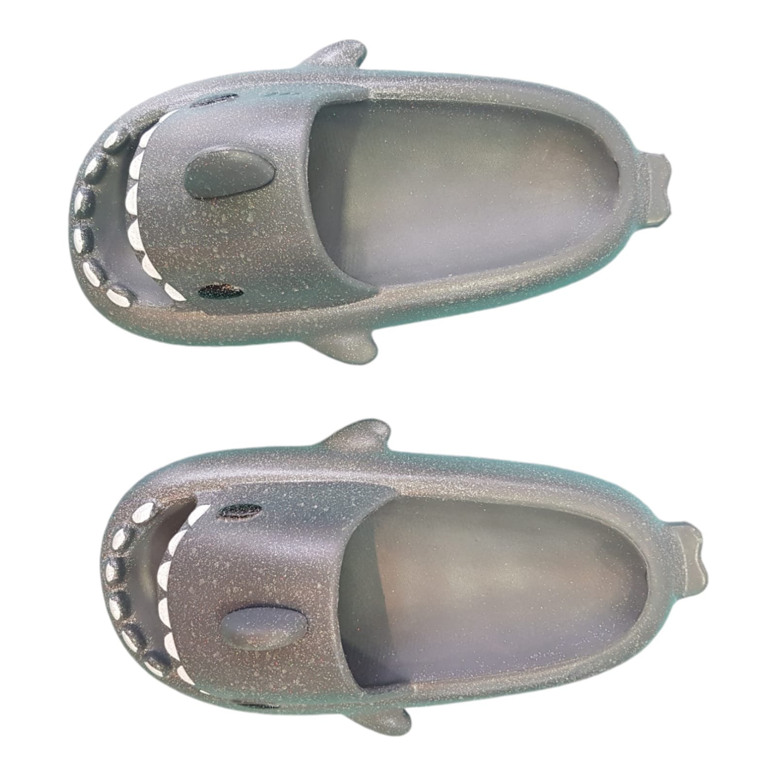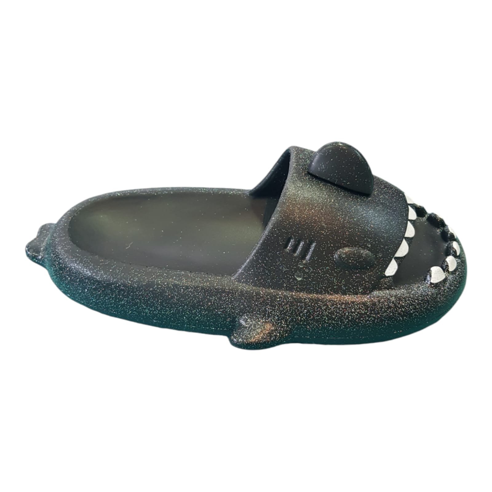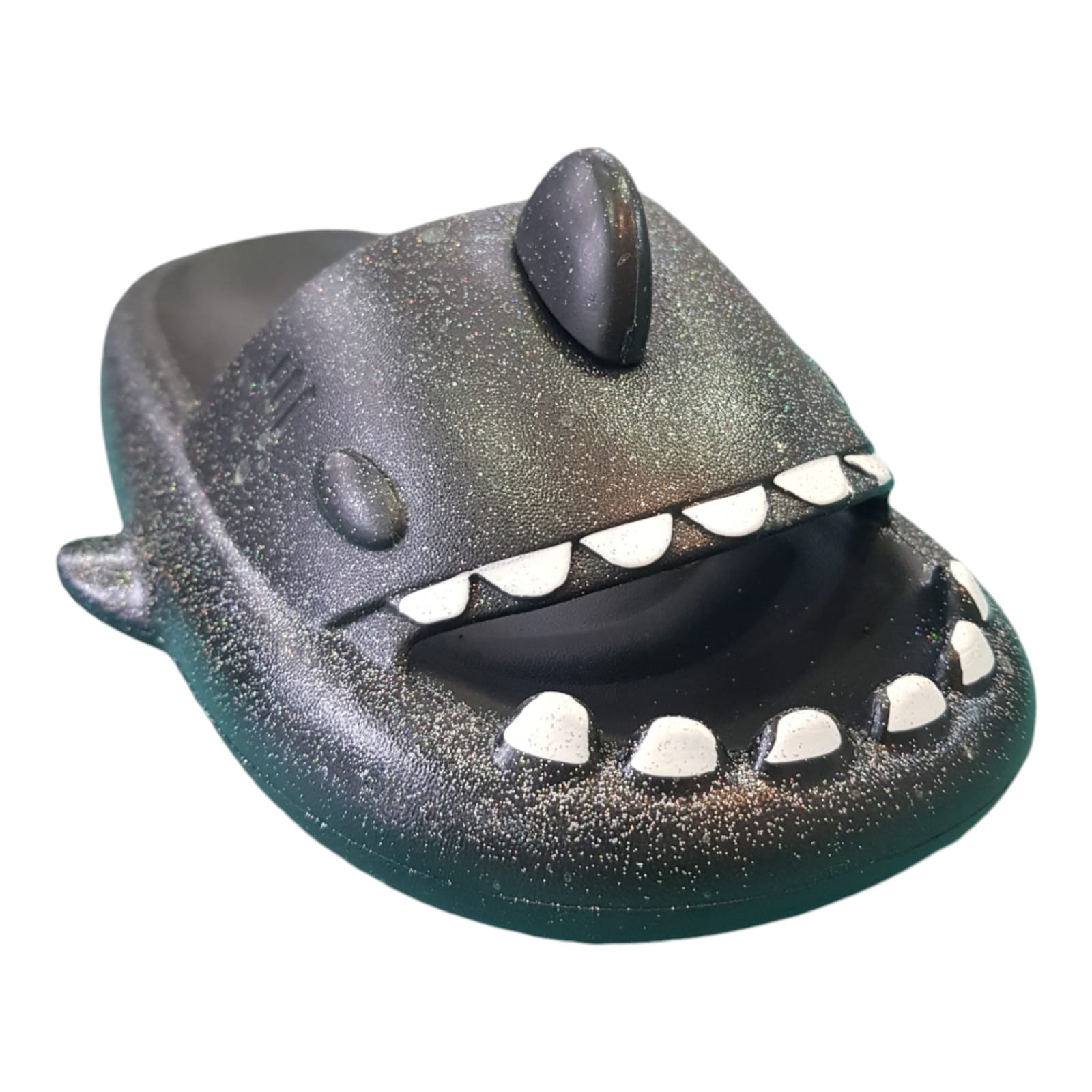 Chanclas para el agua en forma de tiburón. De goma importada, liviana, flexible y full color. Con detalles que brillan en la oscuridad.