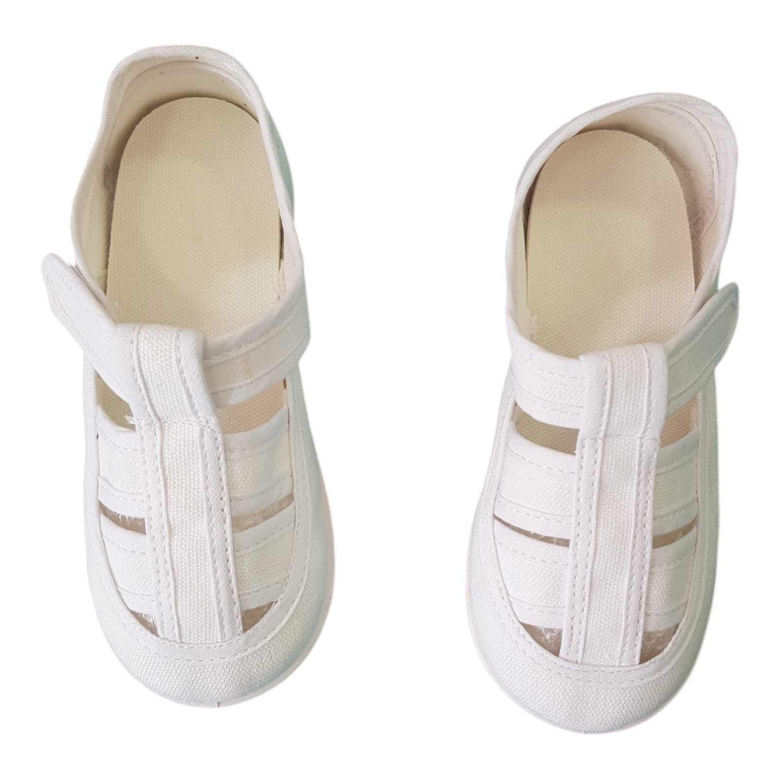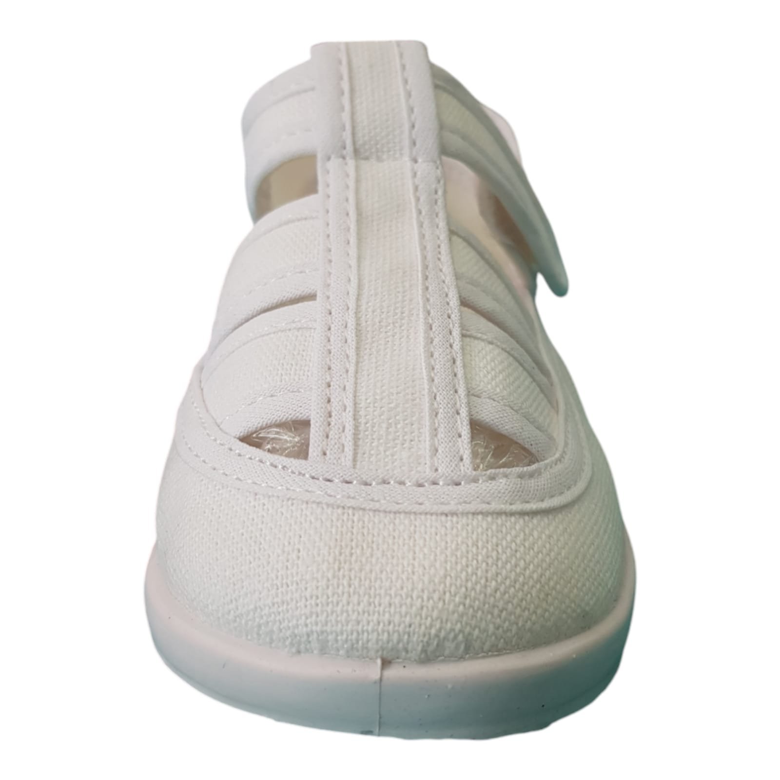 Franciscanas de lona blanca con agarre de velcro resistente y ribete en el mismo color. Con planta de goma liviana y flexible.