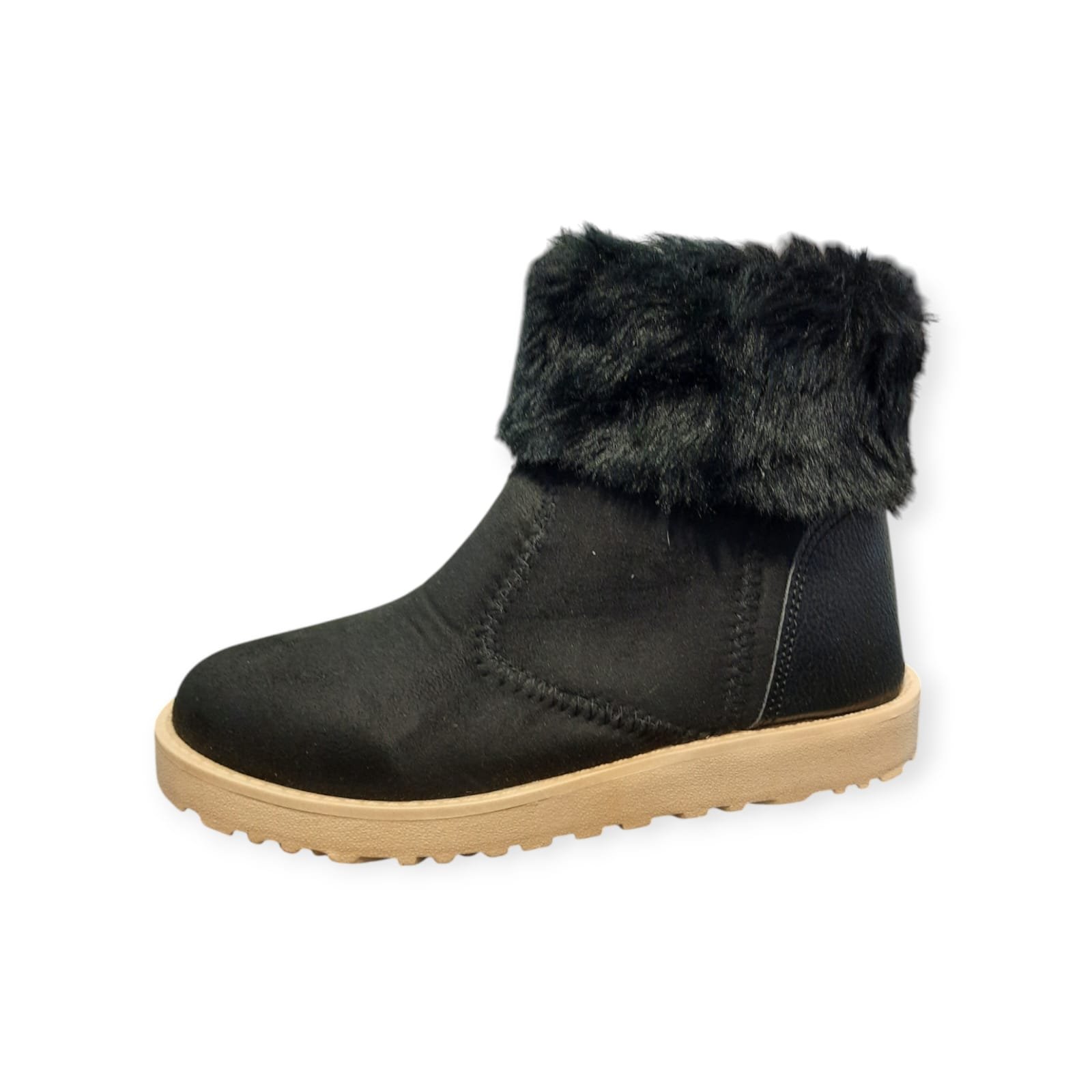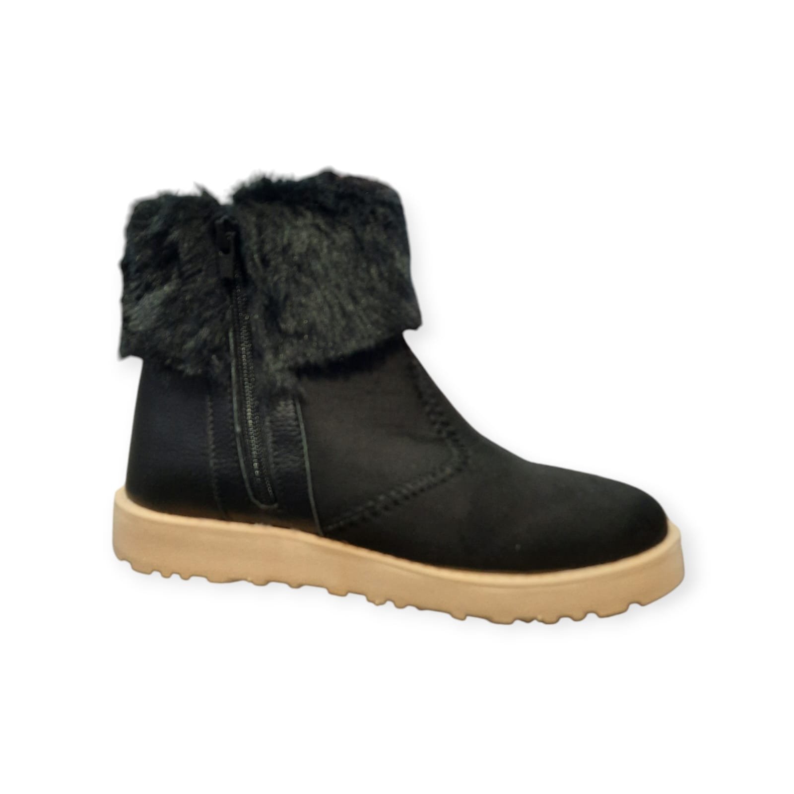 Botas media caña con piel al tono. Capellada de materiales sintéticos suaves, flexibles y calentitos. Con cierre interno para mas comodidad. Con base de goma firme. Con dibujos en relieves en la planta.