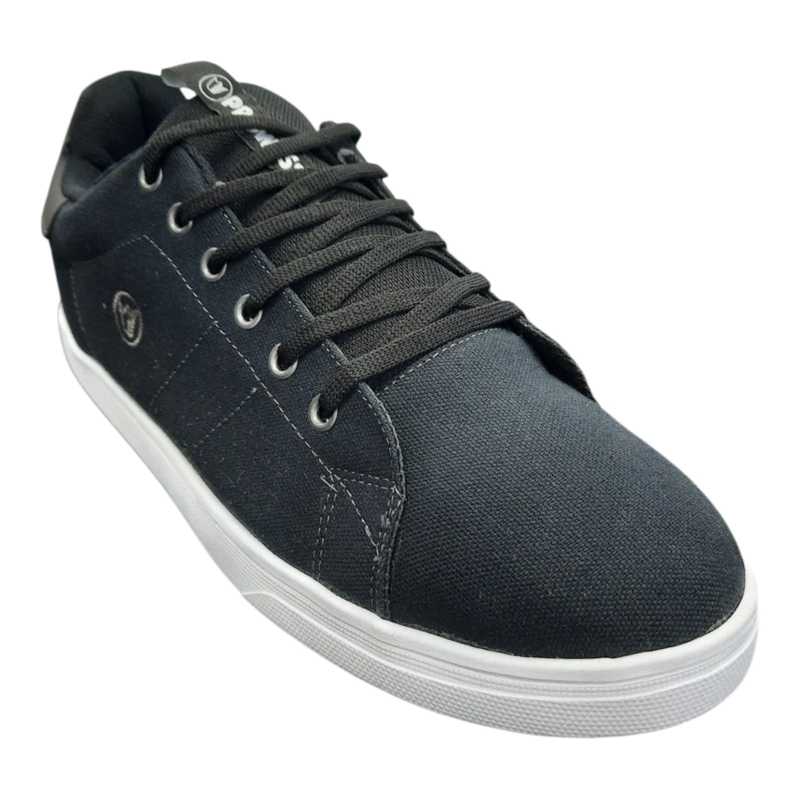 Zapatillas estilo casual con cordones. Su capellada confeccionada enteramente en lona color negro. Planta resistente color blanco. Flexible y liviana.