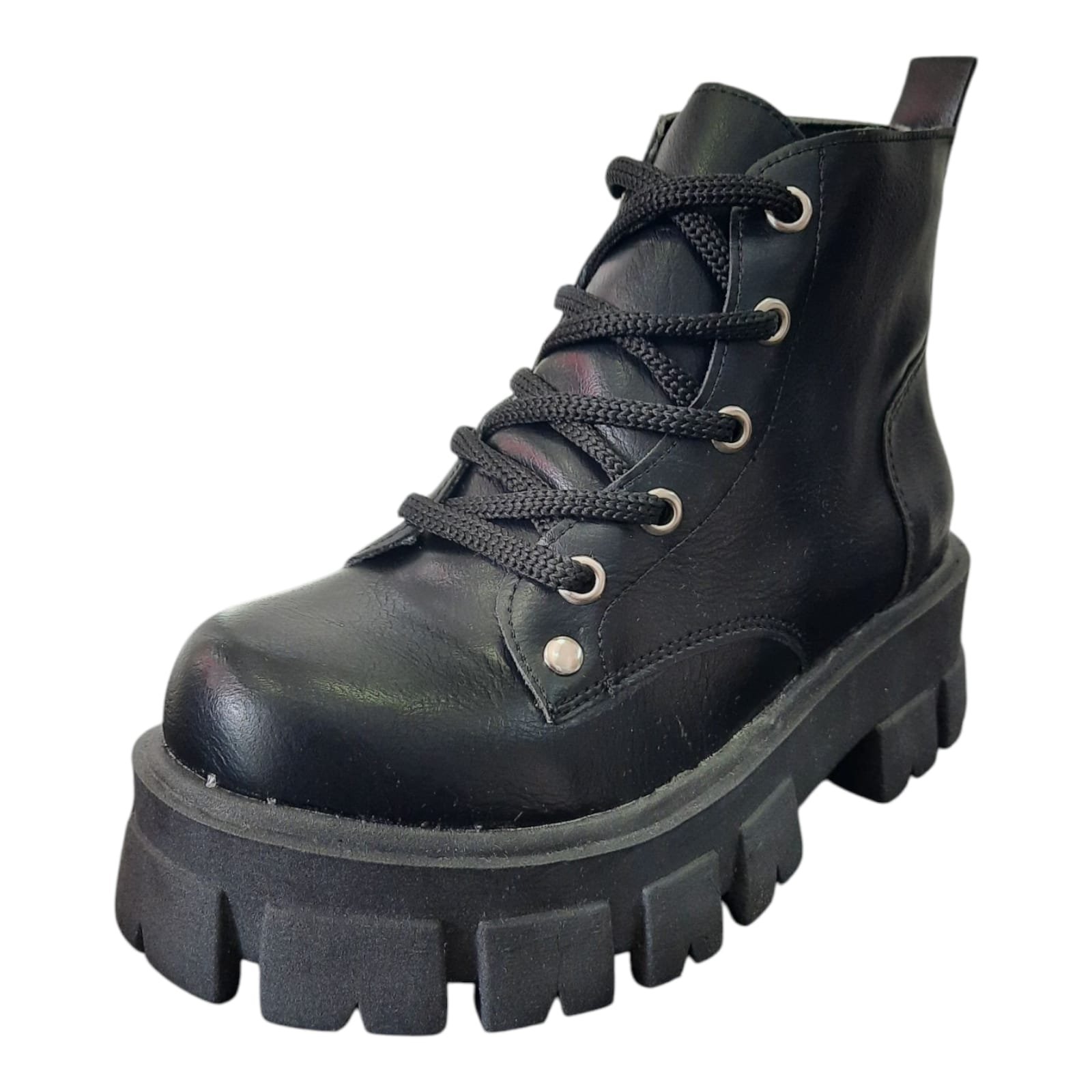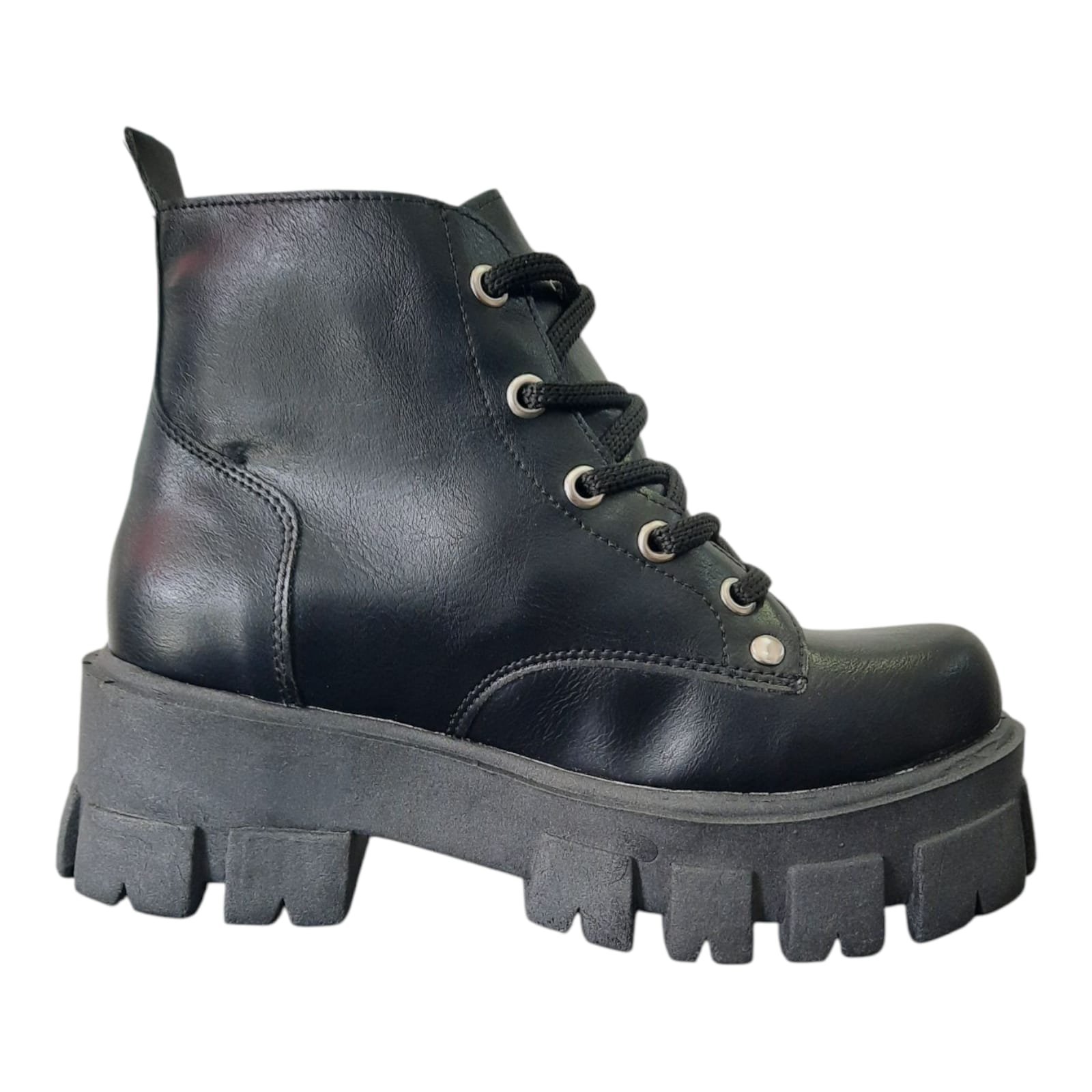 Borcegos media caña de materiales sintéticos. Capellada de símil cuero color negro. Ojalillos metálicos y cordones fuerte. Planta dentada de goma en plataforma.