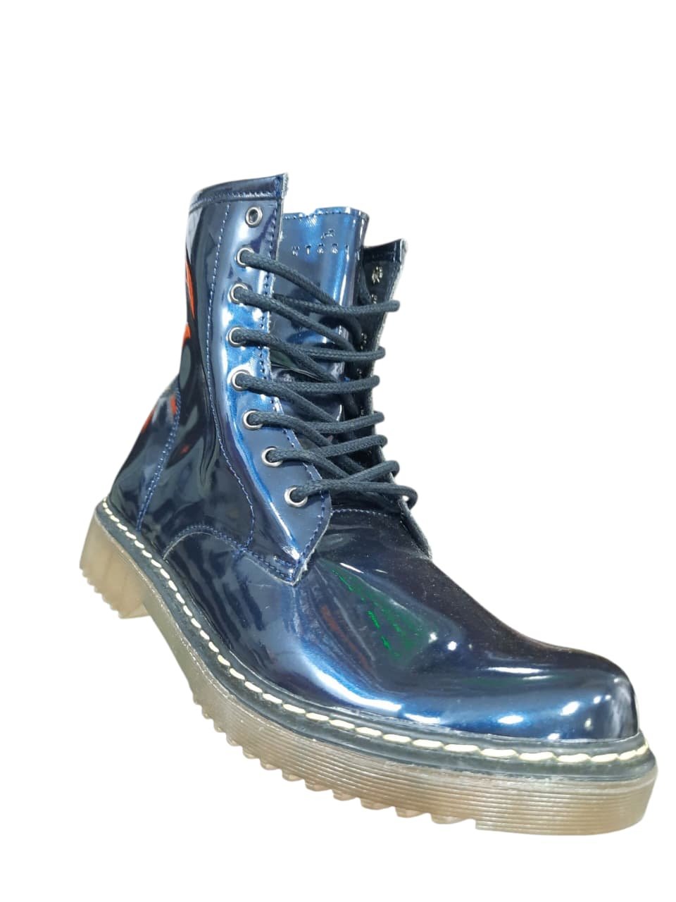 Borcegos acordonados con capellada tornasol tipo charol. Planta de goma traslúcida en color caramel.