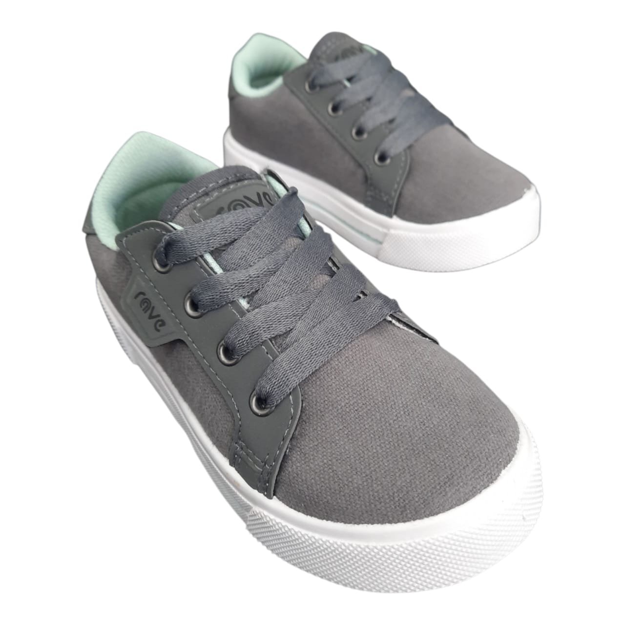 Zapatillas de lona con ojales metálicos en color gris. Cordones de algodón y capellada de lona con vivos en símil cuero. Planta de goma antideslizante liviana y flexible.