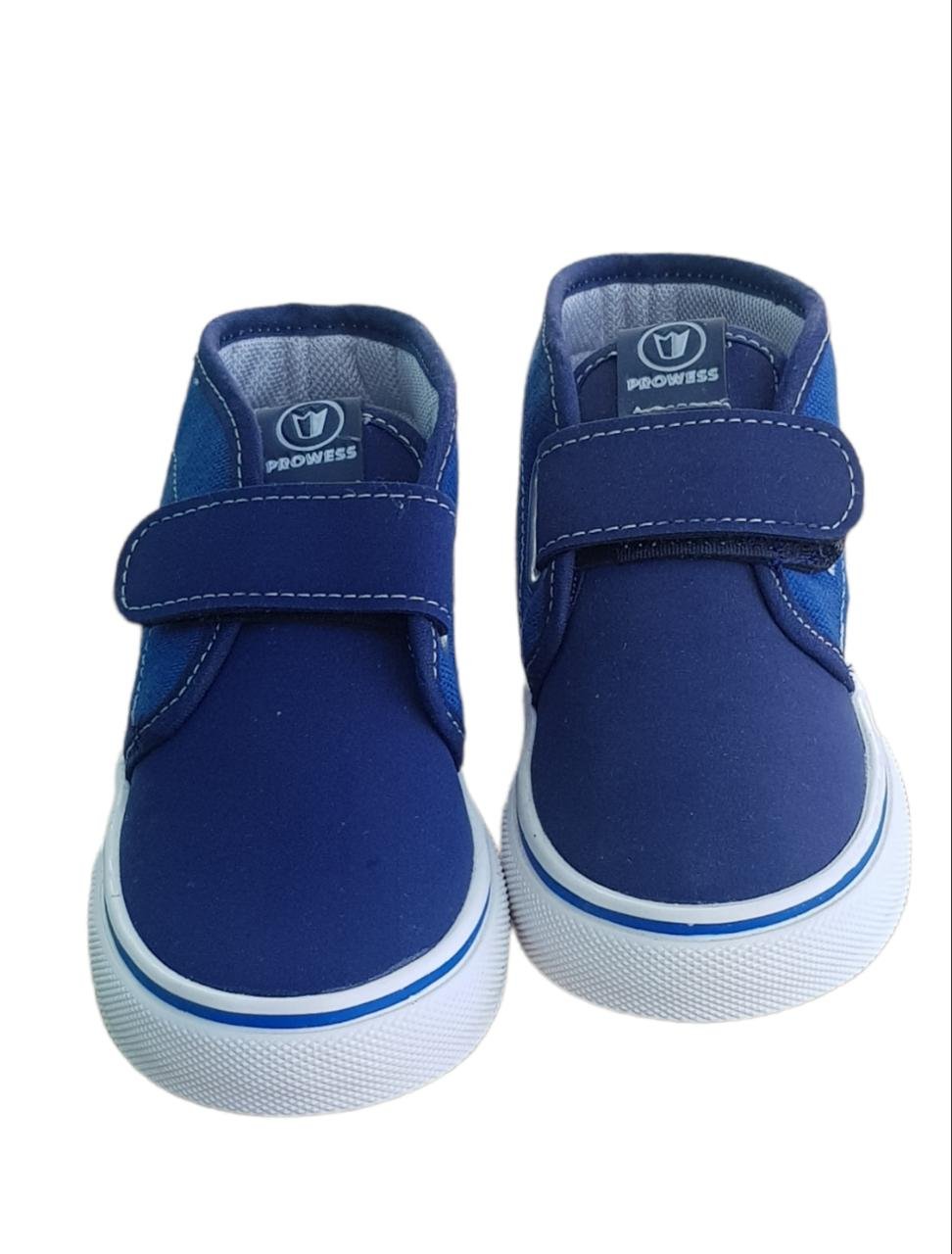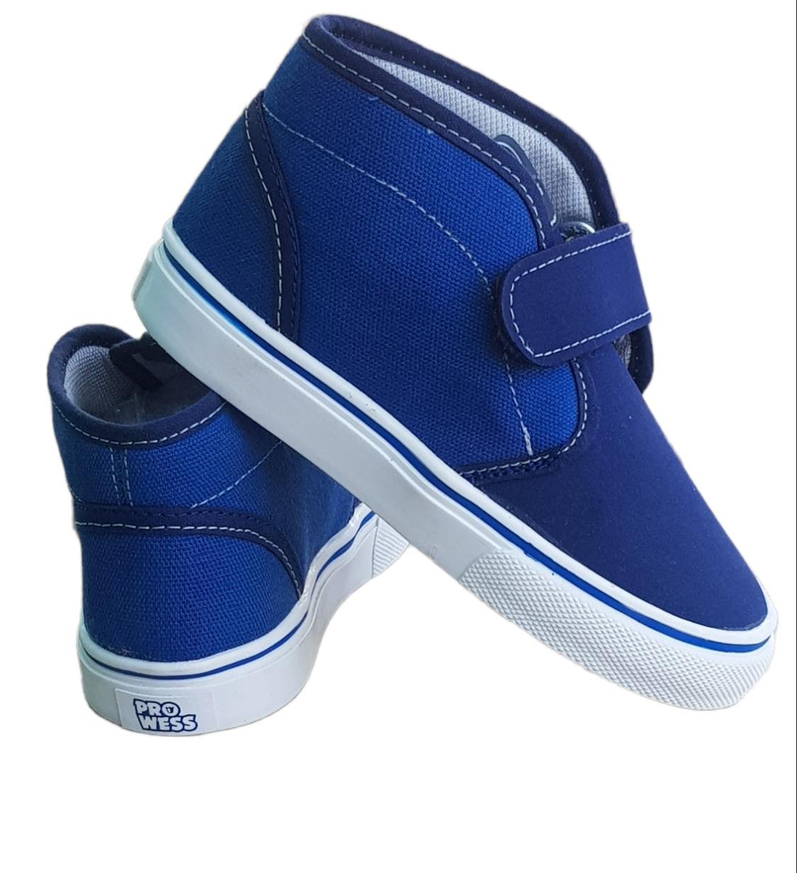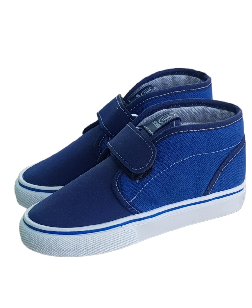 Botitas de lona azul, con abrojo, y con planta blanca.