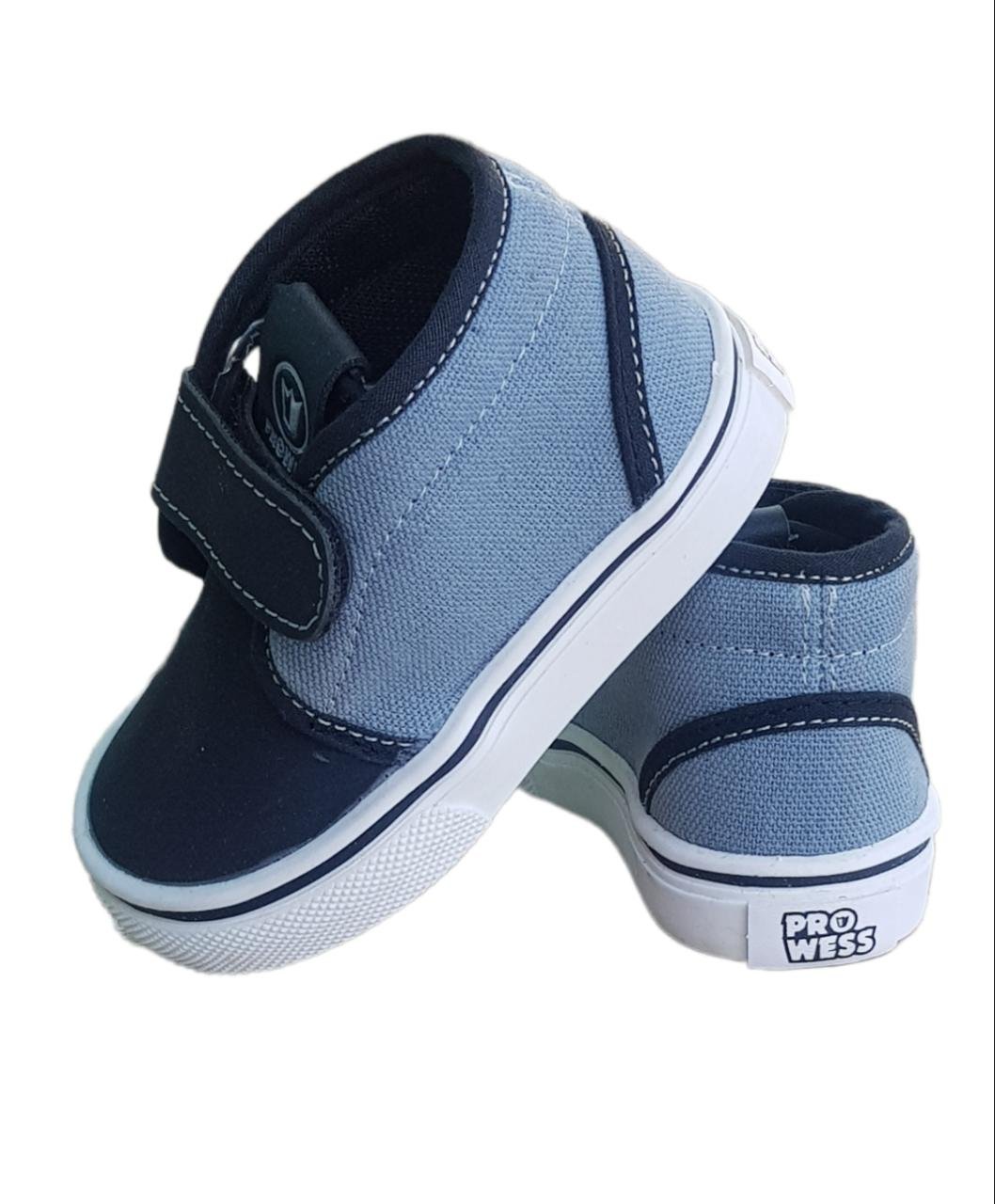 Botita de lona gris con detalles negros, posee abrojo y una planta blanca.